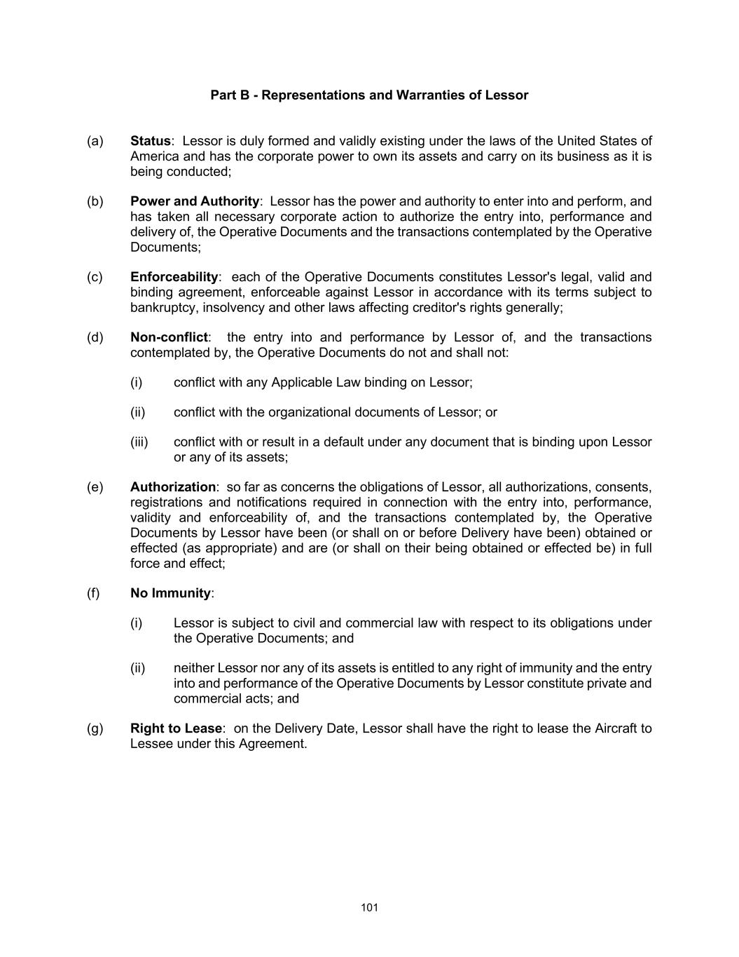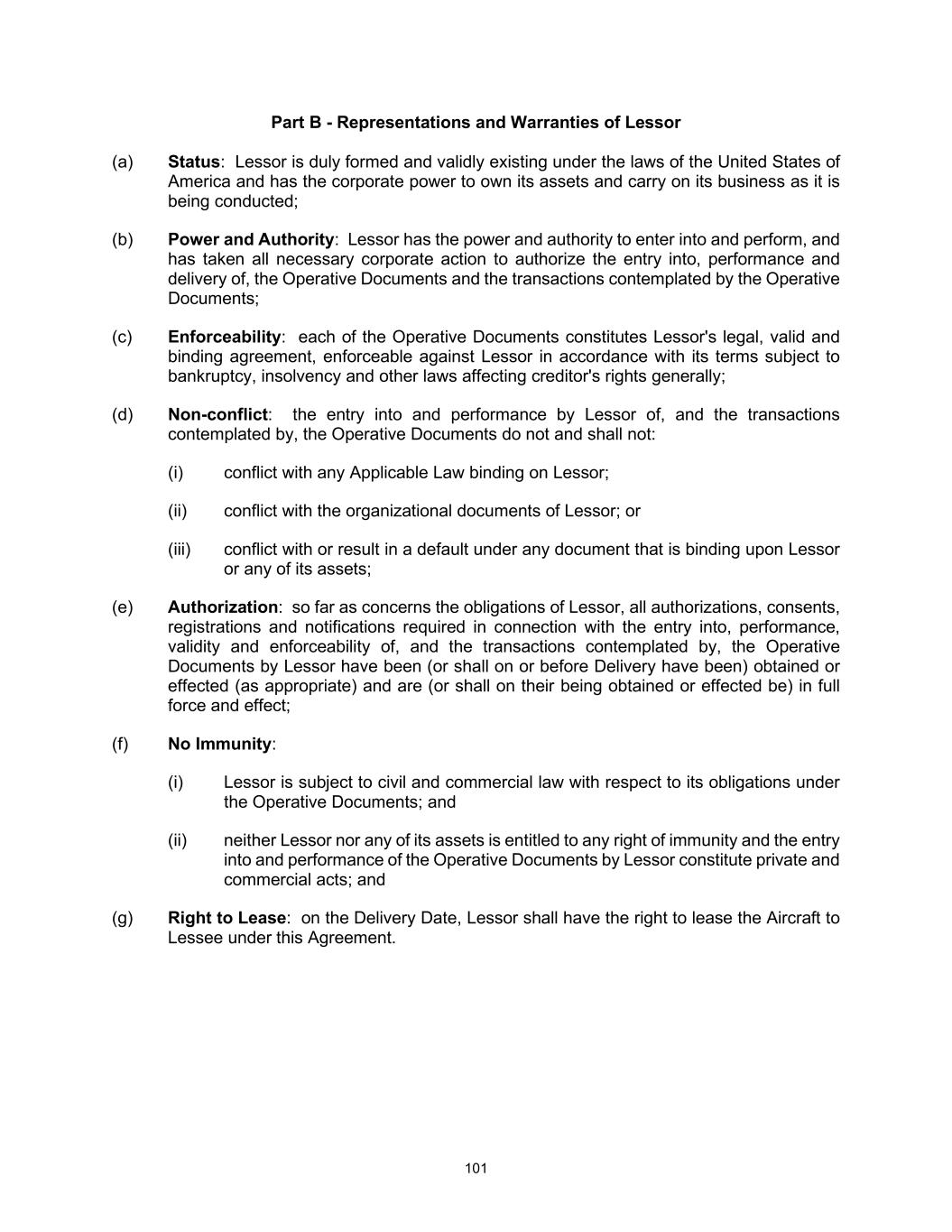 101 Part B - Representations and Warranties of Lessor (a) Status: Lessor is duly formed and validly existing under the laws of the United States of America and has the corporate power to own its assets and carry on its business as it is being conducted; (b) Power and Authority: Lessor has the power and authority to enter into and perform, and has taken all necessary corporate action to authorize the entry into, performance and delivery of, the Operative Documents and the transactions contemplated by the Operative Documents; (c) Enforceability: each of the Operative Documents constitutes Lessor's legal, valid and binding agreement, enforceable against Lessor in accordance with its terms subject to bankruptcy, insolvency and other laws affecting creditor's rights generally; (d) Non-conflict: the entry into and performance by Lessor of, and the transactions contemplated by, the Operative Documents do not and shall not: (i) conflict with any Applicable Law binding on Lessor; (ii) conflict with the organizational documents of Lessor; or (iii) conflict with or result in a default under any document that is binding upon Lessor or any of its assets; (e) Authorization: so far as concerns the obligations of Lessor, all authorizations, consents, registrations and notifications required in connection with the entry into, performance, validity and enforceability of, and the transactions contemplated by, the Operative Documents by Lessor have been (or shall on or before Delivery have been) obtained or effected (as appropriate) and are (or shall on their being obtained or effected be) in full force and effect; (f) No Immunity: (i) Lessor is subject to civil and commercial law with respect to its obligations under the Operative Documents; and (ii) neither Lessor nor any of its assets is entitled to any right of immunity and the entry into and performance of the Operative Documents by Lessor constitute private and commercial acts; and (g) Right to Lease: on the Delivery Date, Lessor shall have the right to lease the Aircraft to Lessee under this Agreement.