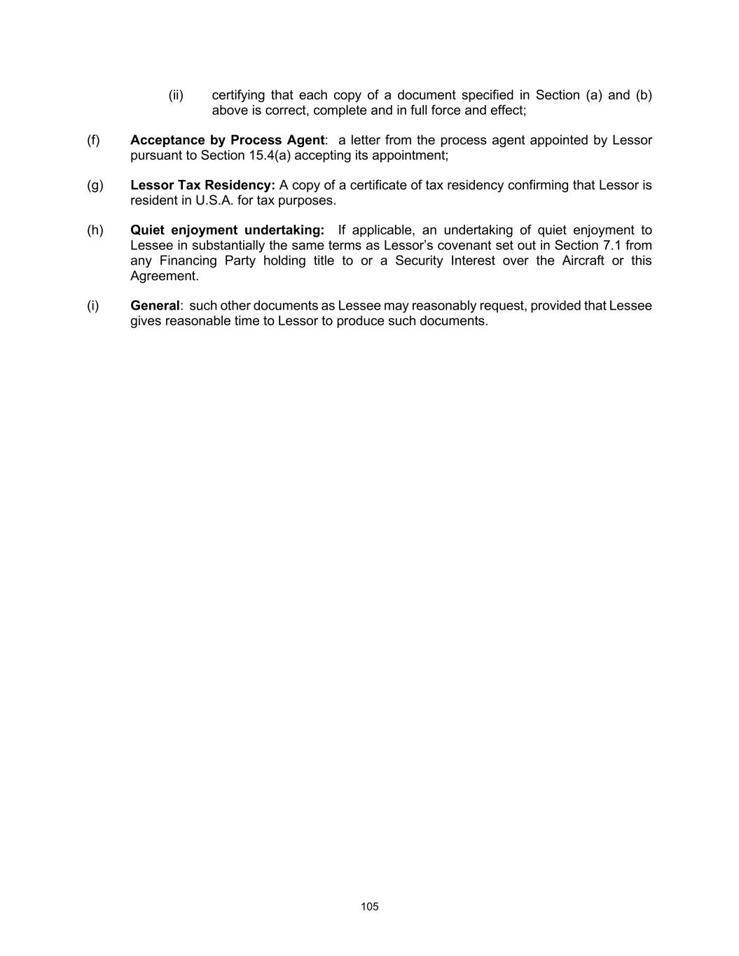 105 (ii) certifying that each copy of a document specified in Section (a) and (b) above is correct, complete and in full force and effect; (f) Acceptance by Process Agent: a letter from the process agent appointed by Lessor pursuant to Section 15.4(a) accepting its appointment; (g) Lessor Tax Residency: A copy of a certificate of tax residency confirming that Lessor is resident in U.S.A. for tax purposes. (h) Quiet enjoyment undertaking: If applicable, an undertaking of quiet enjoyment to Lessee in substantially the same terms as Lessor’s covenant set out in Section 7.1 from any Financing Party holding title to or a Security Interest over the Aircraft or this Agreement. (i) General: such other documents as Lessee may reasonably request, provided that Lessee gives reasonable time to Lessor to produce such documents.