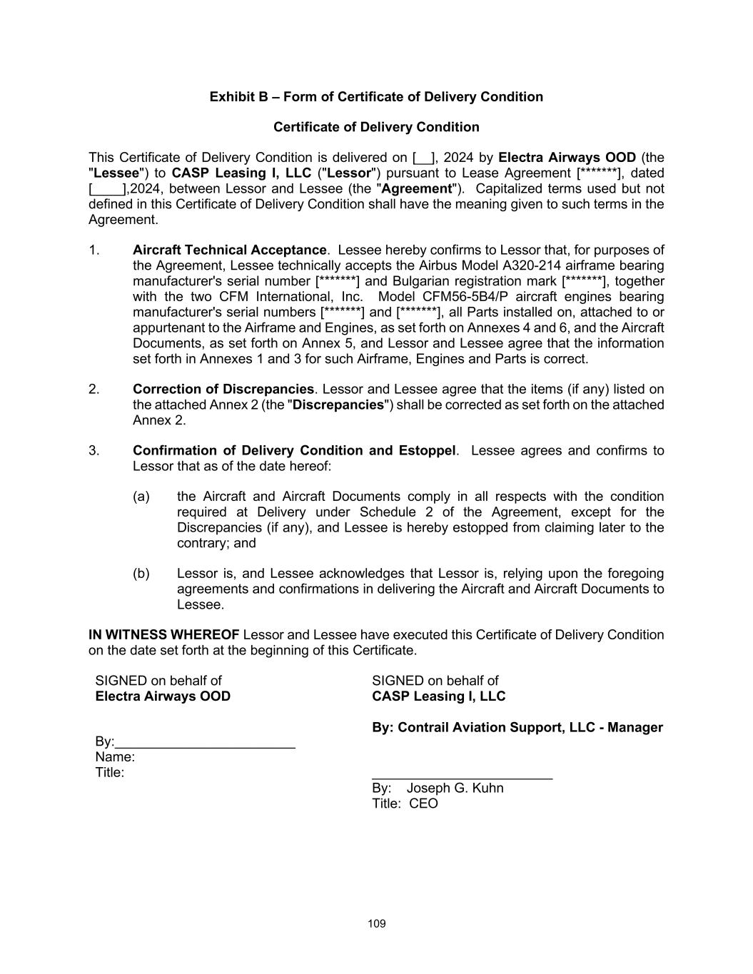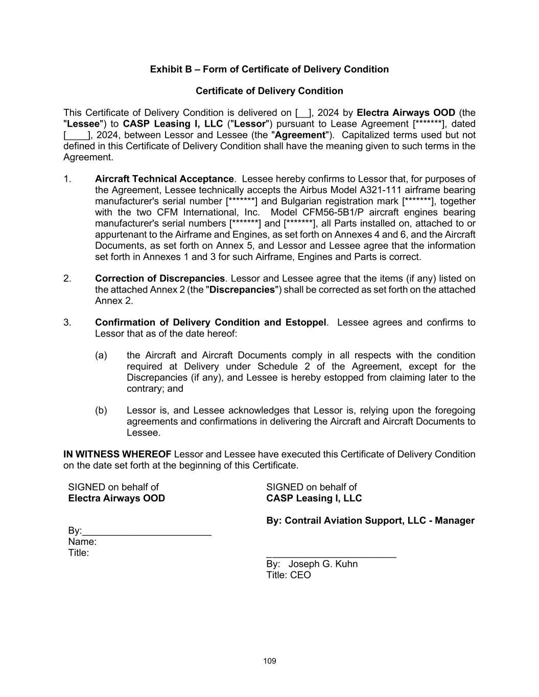 109 Exhibit B – Form of Certificate of Delivery Condition Certificate of Delivery Condition This Certificate of Delivery Condition is delivered on [__], 2024 by Electra Airways OOD (the "Lessee") to CASP Leasing I, LLC ("Lessor") pursuant to Lease Agreement [*******], dated [____], 2024, between Lessor and Lessee (the "Agreement"). Capitalized terms used but not defined in this Certificate of Delivery Condition shall have the meaning given to such terms in the Agreement. 1. Aircraft Technical Acceptance. Lessee hereby confirms to Lessor that, for purposes of the Agreement, Lessee technically accepts the Airbus Model A321-111 airframe bearing manufacturer's serial number [*******] and Bulgarian registration mark [*******], together with the two CFM International, Inc. Model CFM56-5B1/P aircraft engines bearing manufacturer's serial numbers [*******] and [*******], all Parts installed on, attached to or appurtenant to the Airframe and Engines, as set forth on Annexes 4 and 6, and the Aircraft Documents, as set forth on Annex 5, and Lessor and Lessee agree that the information set forth in Annexes 1 and 3 for such Airframe, Engines and Parts is correct. 2. Correction of Discrepancies. Lessor and Lessee agree that the items (if any) listed on the attached Annex 2 (the "Discrepancies") shall be corrected as set forth on the attached Annex 2. 3. Confirmation of Delivery Condition and Estoppel. Lessee agrees and confirms to Lessor that as of the date hereof: (a) the Aircraft and Aircraft Documents comply in all respects with the condition required at Delivery under Schedule 2 of the Agreement, except for the Discrepancies (if any), and Lessee is hereby estopped from claiming later to the contrary; and (b) Lessor is, and Lessee acknowledges that Lessor is, relying upon the foregoing agreements and confirmations in delivering the Aircraft and Aircraft Documents to Lessee. IN WITNESS WHEREOF Lessor and Lessee have executed this Certificate of Delivery Condition on the date set forth at the beginning of this Certificate. SIGNED on behalf of Electra Airways OOD By:________________________ Name: Title: SIGNED on behalf of CASP Leasing I, LLC By: Contrail Aviation Support, LLC - Manager _ _______________________ By: Joseph G. Kuhn Title: CEO