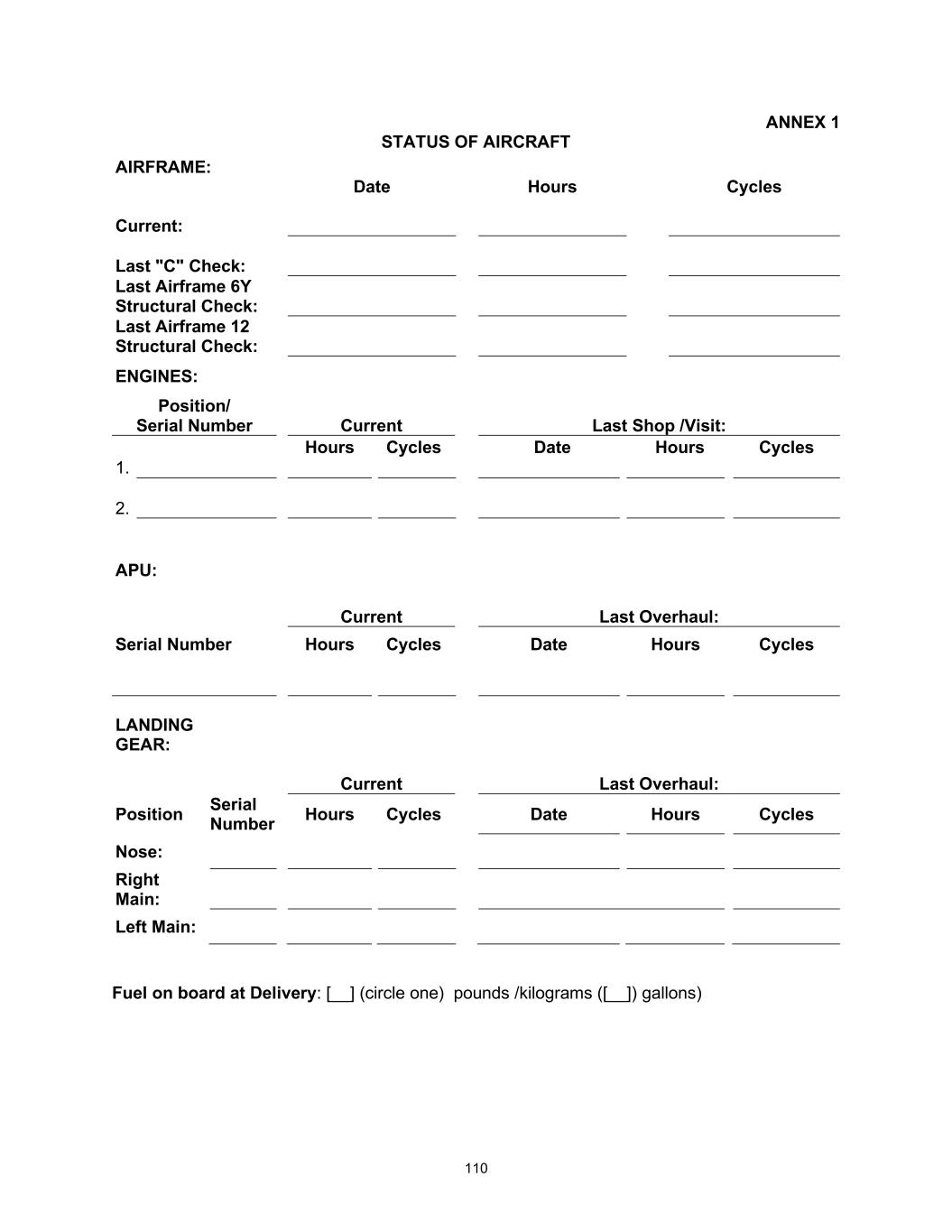 110 ANNEX 1 STATUS OF AIRCRAFT AIRFRAME: Date Hours Cycles Current: Last "C" Check: Last Airframe 6Y Structural Check: Last Airframe 12 Structural Check: ENGINES: Position/ Serial Number Current Last Shop /Visit: Hours Cycles Date Hours Cycles 1. 2. APU: Current Last Overhaul: Serial Number Hours Cycles Date Hours Cycles LANDING GEAR: Current Last Overhaul: Position Serial Number Hours Cycles Date Hours Cycles Nose: Right Main: Left Main: Fuel on board at Delivery: [__] (circle one) pounds /kilograms ([__]) gallons)