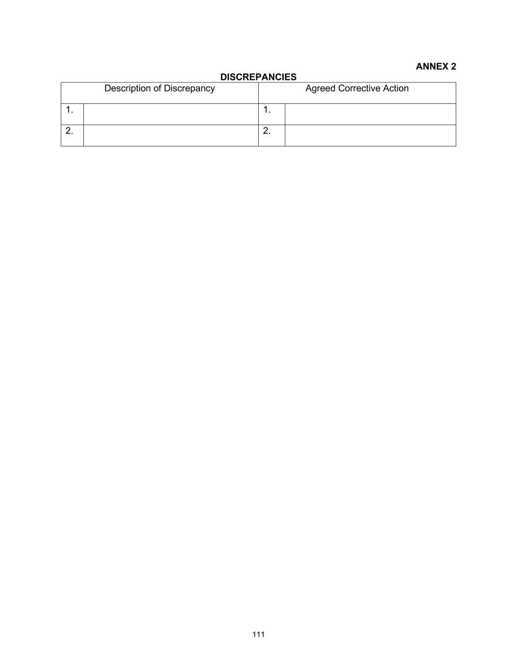 111 ANNEX 2 DISCREPANCIES Description of Discrepancy Agreed Corrective Action 1. 1. 2. 2.