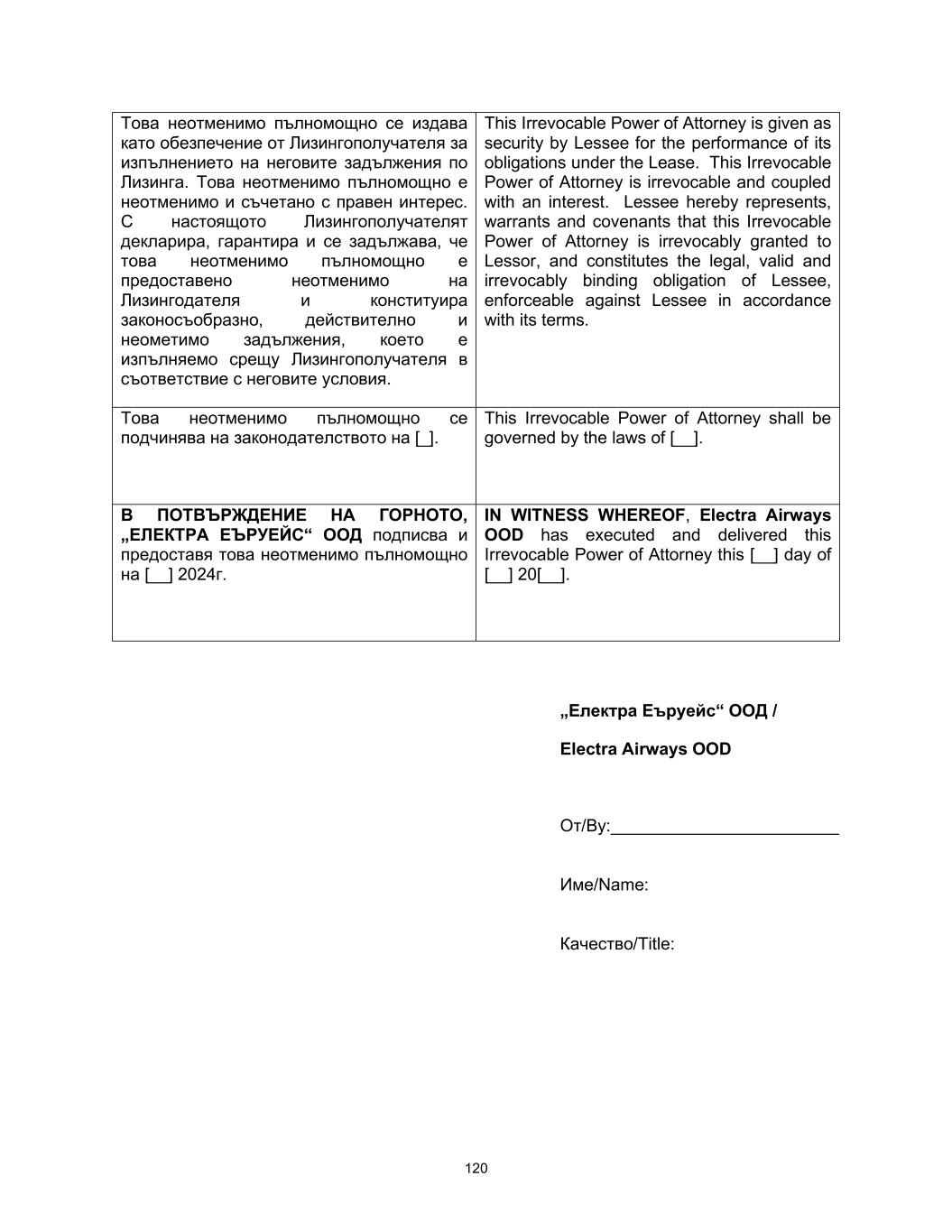 120 Това неотменимо пълномощно се издава като обезпечение от Лизингополучателя за изпълнението на неговите задължения по Лизинга. Това неотменимо пълномощно е неотменимо и съчетано с правен интерес. С настоящото Лизингополучателят декларира, гарантира и се задължава, че това неотменимо пълномощно е предоставено неотменимо на Лизингодателя и конституира законосъобразно, действително и неометимо задължения, което е изпълняемо срещу Лизингополучателя в съответствие с неговите условия. This Irrevocable Power of Attorney is given as security by Lessee for the performance of its obligations under the Lease. This Irrevocable Power of Attorney is irrevocable and coupled with an interest. Lessee hereby represents, warrants and covenants that this Irrevocable Power of Attorney is irrevocably granted to Lessor, and constitutes the legal, valid and irrevocably binding obligation of Lessee, enforceable against Lessee in accordance with its terms. Това неотменимо пълномощно се подчинява на законодателството на [_]. This Irrevocable Power of Attorney shall be governed by the laws of [__]. В ПОТВЪРЖДЕНИЕ НА ГОРНОТО, „ЕЛЕКТРА ЕЪРУЕЙС“ ООД подписва и предоставя това неотменимо пълномощно на [__] 2024г. IN WITNESS WHEREOF, Electra Airways OOD has executed and delivered this Irrevocable Power of Attorney this [__] day of [__] 20[__]. „Електра Еъруейс“ ООД / Еlectra Airways OOD От/By:________________________ Име/Name: Качество/Title: