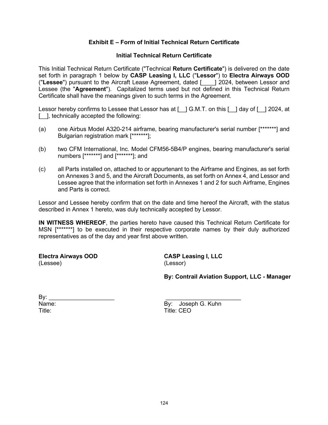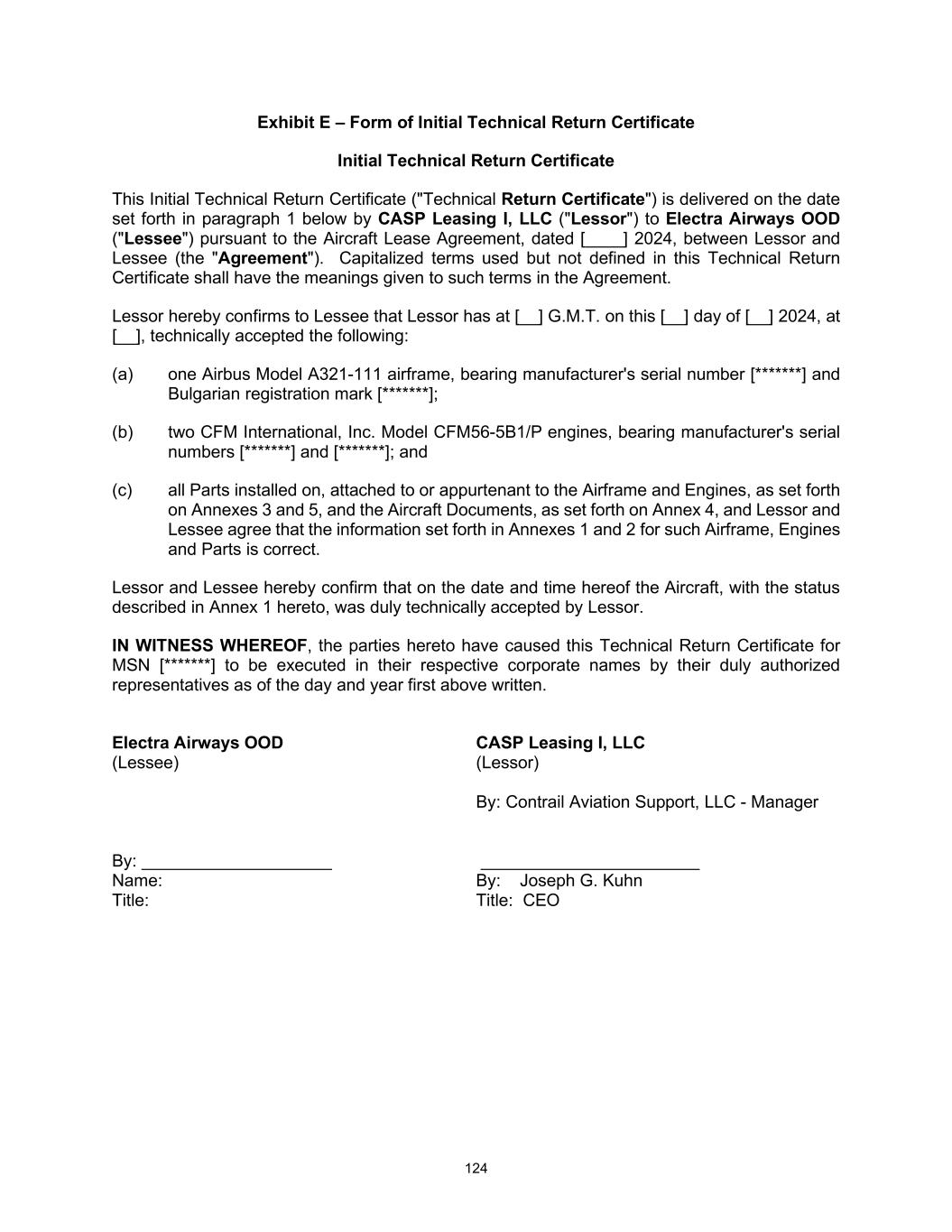 124 Exhibit E – Form of Initial Technical Return Certificate Initial Technical Return Certificate This Initial Technical Return Certificate ("Technical Return Certificate") is delivered on the date set forth in paragraph 1 below by CASP Leasing I, LLC ("Lessor") to Electra Airways OOD ("Lessee") pursuant to the Aircraft Lease Agreement, dated [____] 2024, between Lessor and Lessee (the "Agreement"). Capitalized terms used but not defined in this Technical Return Certificate shall have the meanings given to such terms in the Agreement. Lessor hereby confirms to Lessee that Lessor has at [__] G.M.T. on this [__] day of [__] 2024, at [__], technically accepted the following: (a) one Airbus Model A321-111 airframe, bearing manufacturer's serial number [*******] and Bulgarian registration mark [*******]; (b) two CFM International, Inc. Model CFM56-5B1/P engines, bearing manufacturer's serial numbers [*******] and [*******]; and (c) all Parts installed on, attached to or appurtenant to the Airframe and Engines, as set forth on Annexes 3 and 5, and the Aircraft Documents, as set forth on Annex 4, and Lessor and Lessee agree that the information set forth in Annexes 1 and 2 for such Airframe, Engines and Parts is correct. Lessor and Lessee hereby confirm that on the date and time hereof the Aircraft, with the status described in Annex 1 hereto, was duly technically accepted by Lessor. IN WITNESS WHEREOF, the parties hereto have caused this Technical Return Certificate for MSN [*******] to be executed in their respective corporate names by their duly authorized representatives as of the day and year first above written. Electra Airways OOD CASP Leasing I, LLC (Lessee) (Lessor) By: Contrail Aviation Support, LLC - Manager By: ____________________ _______________________ Name: By: Joseph G. Kuhn Title: Title: CEO
