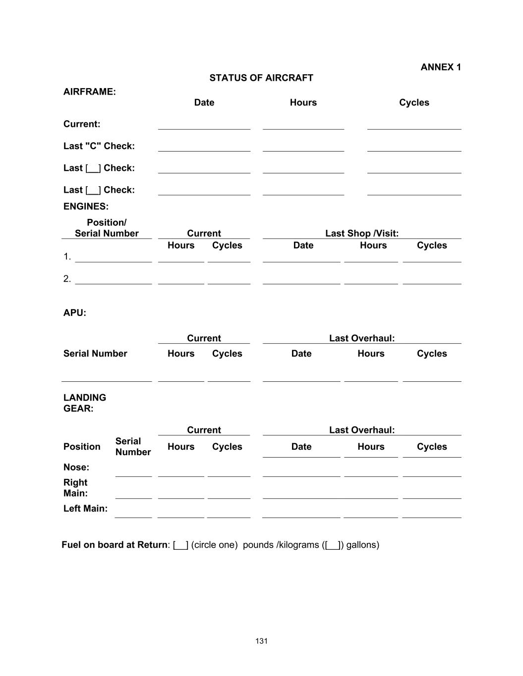 131 ANNEX 1 STATUS OF AIRCRAFT AIRFRAME: Date Hours Cycles Current: Last "C" Check: Last [__] Check: Last [__] Check: ENGINES: Position/ Serial Number Current Last Shop /Visit: Hours Cycles Date Hours Cycles 1. 2. APU: Current Last Overhaul: Serial Number Hours Cycles Date Hours Cycles LANDING GEAR: Current Last Overhaul: Position Serial Number Hours Cycles Date Hours Cycles Nose: Right Main: Left Main: Fuel on board at Return: [__] (circle one) pounds /kilograms ([__]) gallons)