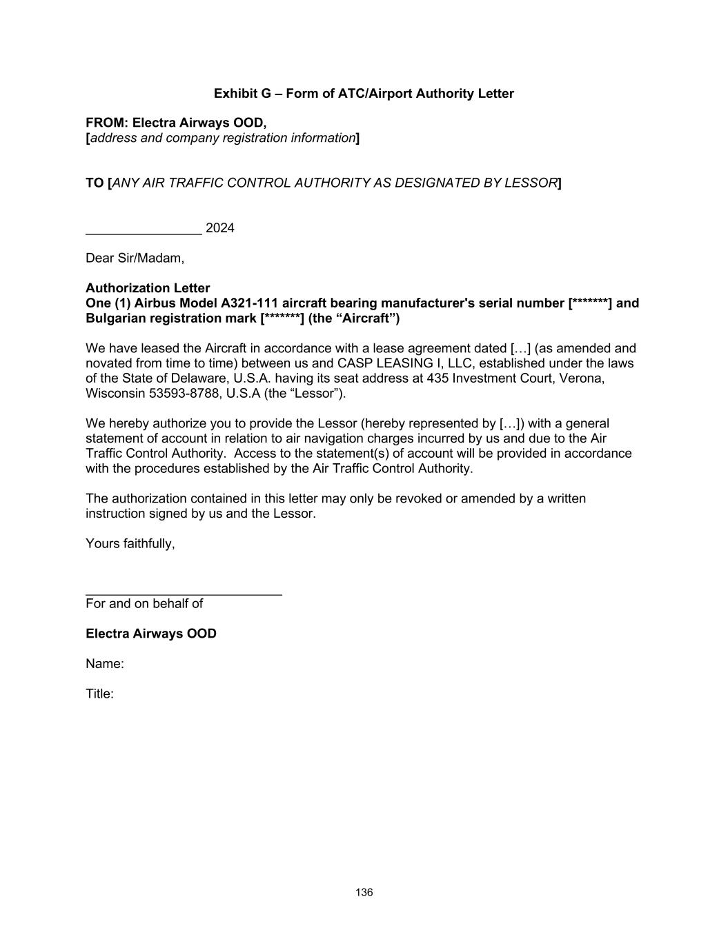 136 Exhibit G – Form of ATC/Airport Authority Letter FROM: Electra Airways OOD, [address and company registration information] TO [ANY AIR TRAFFIC CONTROL AUTHORITY AS DESIGNATED BY LESSOR] ________________ 2024 Dear Sir/Madam, Authorization Letter One (1) Airbus Model A321-111 aircraft bearing manufacturer's serial number [*******] and Bulgarian registration mark [*******] (the “Aircraft”) We have leased the Aircraft in accordance with a lease agreement dated […] (as amended and novated from time to time) between us and CASP LEASING I, LLC, established under the laws of the State of Delaware, U.S.A. having its seat address at 435 Investment Court, Verona, Wisconsin 53593-8788, U.S.A (the “Lessor”). We hereby authorize you to provide the Lessor (hereby represented by […]) with a general statement of account in relation to air navigation charges incurred by us and due to the Air Traffic Control Authority. Access to the statement(s) of account will be provided in accordance with the procedures established by the Air Traffic Control Authority. The authorization contained in this letter may only be revoked or amended by a written instruction signed by us and the Lessor. Yours faithfully, ___________________________ For and on behalf of Electra Airways OOD Name: Title: