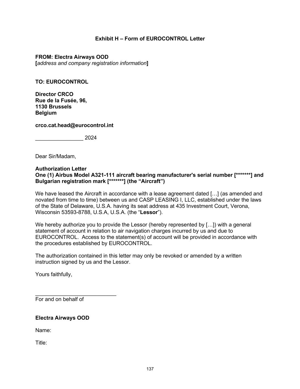 137 Exhibit H – Form of EUROCONTROL Letter FROM: Electra Airways OOD [address and company registration information] TO: EUROCONTROL Director CRCO Rue de la Fusée, 96, 1130 Brussels Belgium crco.cat.head@eurocontrol.int ________________ 2024 Dear Sir/Madam, Authorization Letter One (1) Airbus Model A321-111 aircraft bearing manufacturer's serial number [*******] and Bulgarian registration mark [*******] (the “Aircraft”) We have leased the Aircraft in accordance with a lease agreement dated […] (as amended and novated from time to time) between us and CASP LEASING I, LLC, established under the laws of the State of Delaware, U.S.A. having its seat address at 435 Investment Court, Verona, Wisconsin 53593-8788, U.S.A, U.S.A. (the “Lessor”). We hereby authorize you to provide the Lessor (hereby represented by […]) with a general statement of account in relation to air navigation charges incurred by us and due to EUROCONTROL. Access to the statement(s) of account will be provided in accordance with the procedures established by EUROCONTROL. The authorization contained in this letter may only be revoked or amended by a written instruction signed by us and the Lessor. Yours faithfully, ___________________________ For and on behalf of Electra Airways OOD Name: Title: