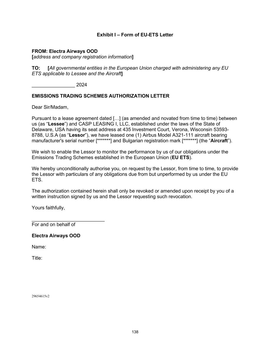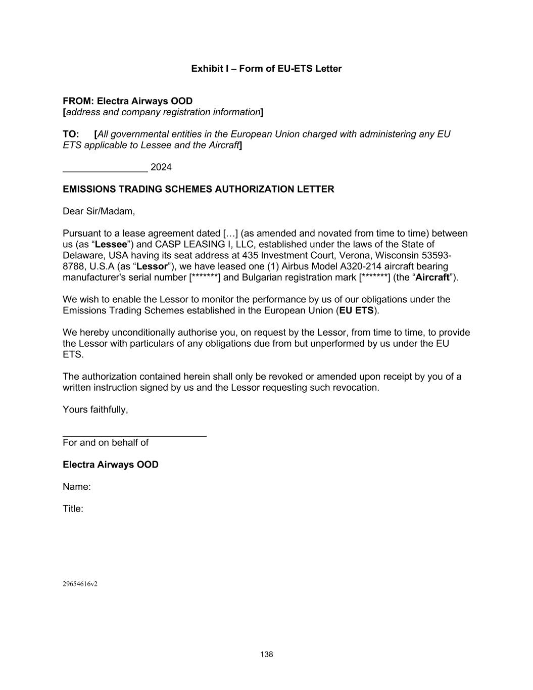 138 Exhibit I – Form of EU-ETS Letter FROM: Electra Airways OOD [address and company registration information] TO: [All governmental entities in the European Union charged with administering any EU ETS applicable to Lessee and the Aircraft] ________________ 2024 EMISSIONS TRADING SCHEMES AUTHORIZATION LETTER Dear Sir/Madam, Pursuant to a lease agreement dated […] (as amended and novated from time to time) between us (as “Lessee”) and CASP LEASING I, LLC, established under the laws of the State of Delaware, USA having its seat address at 435 Investment Court, Verona, Wisconsin 53593- 8788, U.S.A (as “Lessor”), we have leased one (1) Airbus Model A321-111 aircraft bearing manufacturer's serial number [*******] and Bulgarian registration mark [*******] (the “Aircraft”). We wish to enable the Lessor to monitor the performance by us of our obligations under the Emissions Trading Schemes established in the European Union (EU ETS). We hereby unconditionally authorise you, on request by the Lessor, from time to time, to provide the Lessor with particulars of any obligations due from but unperformed by us under the EU ETS. The authorization contained herein shall only be revoked or amended upon receipt by you of a written instruction signed by us and the Lessor requesting such revocation. Yours faithfully, ___________________________ For and on behalf of Electra Airways OOD Name: Title: 29654615v2