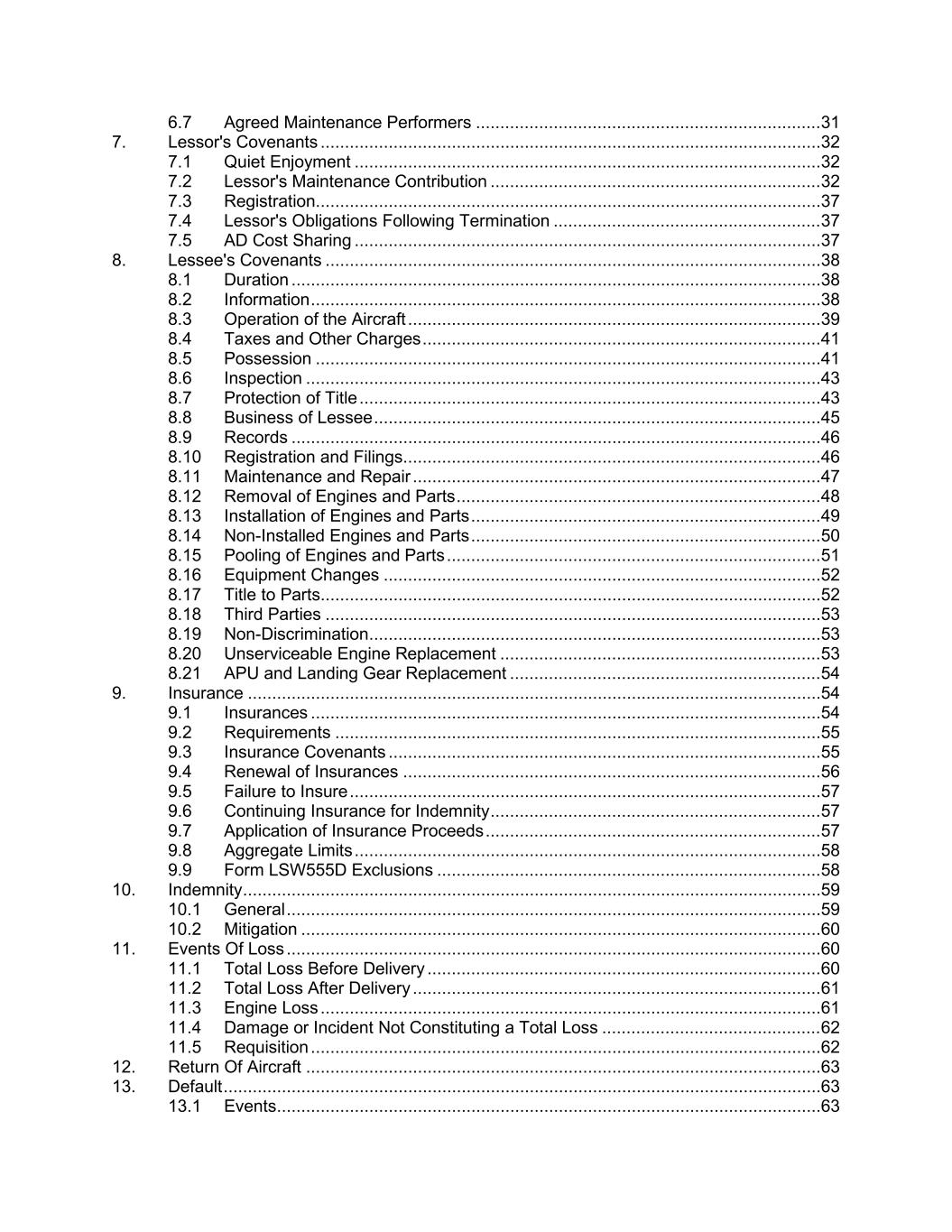 6.7 Agreed Maintenance Performers ....................................................................... 31 7. Lessor's Covenants ....................................................................................................... 32 7.1 Quiet Enjoyment ................................................................................................ 32 7.2 Lessor's Maintenance Contribution .................................................................... 32 7.3 Registration ........................................................................................................ 37 7.4 Lessor's Obligations Following Termination ....................................................... 37 7.5 AD Cost Sharing ................................................................................................ 37 8. Lessee's Covenants ...................................................................................................... 38 8.1 Duration ............................................................................................................. 38 8.2 Information ......................................................................................................... 38 8.3 Operation of the Aircraft ..................................................................................... 39 8.4 Taxes and Other Charges .................................................................................. 41 8.5 Possession ........................................................................................................ 41 8.6 Inspection .......................................................................................................... 43 8.7 Protection of Title ............................................................................................... 43 8.8 Business of Lessee ............................................................................................ 45 8.9 Records ............................................................................................................. 46 8.10 Registration and Filings...................................................................................... 46 8.11 Maintenance and Repair .................................................................................... 47 8.12 Removal of Engines and Parts ........................................................................... 48 8.13 Installation of Engines and Parts ........................................................................ 49 8.14 Non-Installed Engines and Parts ........................................................................ 50 8.15 Pooling of Engines and Parts ............................................................................. 51 8.16 Equipment Changes .......................................................................................... 52 8.17 Title to Parts ....................................................................................................... 52 8.18 Third Parties ...................................................................................................... 53 8.19 Non-Discrimination ............................................................................................. 53 8.20 Unserviceable Engine Replacement .................................................................. 53 8.21 APU and Landing Gear Replacement ................................................................ 54 9. Insurance ...................................................................................................................... 54 9.1 Insurances ......................................................................................................... 54 9.2 Requirements .................................................................................................... 55 9.3 Insurance Covenants ......................................................................................... 55 9.4 Renewal of Insurances ...................................................................................... 56 9.5 Failure to Insure ................................................................................................. 57 9.6 Continuing Insurance for Indemnity .................................................................... 57 9.7 Application of Insurance Proceeds ..................................................................... 57 9.8 Aggregate Limits ................................................................................................ 58 9.9 Form LSW555D Exclusions ............................................................................... 58 10. Indemnity ....................................................................................................................... 59 10.1 General .............................................................................................................. 59 10.2 Mitigation ........................................................................................................... 60 11. Events Of Loss .............................................................................................................. 60 11.1 Total Loss Before Delivery ................................................................................. 60 11.2 Total Loss After Delivery .................................................................................... 61 11.3 Engine Loss ....................................................................................................... 61 11.4 Damage or Incident Not Constituting a Total Loss ............................................. 62 11.5 Requisition ......................................................................................................... 62 12. Return Of Aircraft .......................................................................................................... 63 13. Default ...............................................................................................................