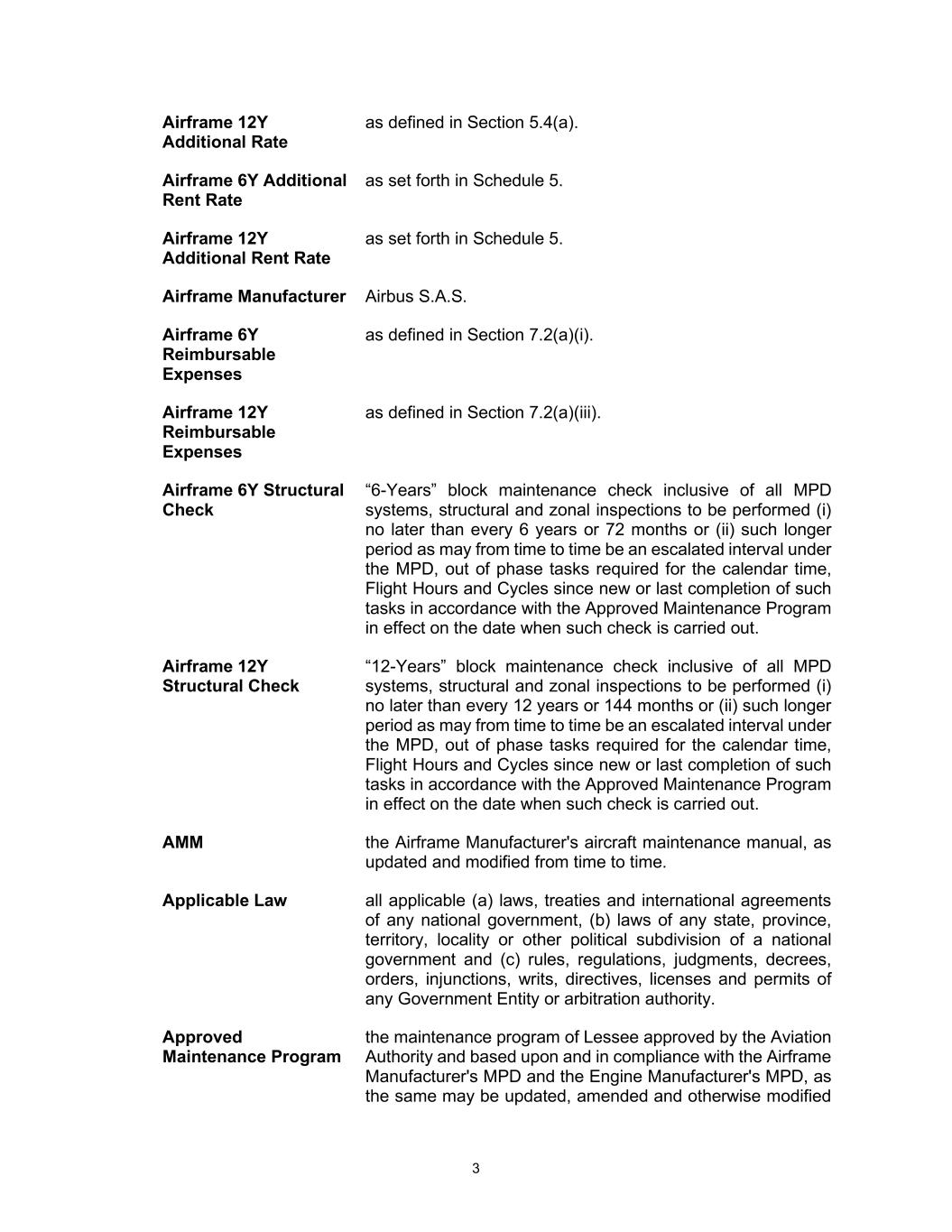 3 Airframe 12Y Additional Rate as defined in Section 5.4(a). Airframe 6Y Additional Rent Rate as set forth in Schedule 5. Airframe 12Y Additional Rent Rate as set forth in Schedule 5. Airframe Manufacturer Airbus S.A.S. Airframe 6Y Reimbursable Expenses as defined in Section 7.2(a)(i). Airframe 12Y Reimbursable Expenses as defined in Section 7.2(a)(iii). Airframe 6Y Structural Check “6-Years” block maintenance check inclusive of all MPD systems, structural and zonal inspections to be performed (i) no later than every 6 years or 72 months or (ii) such longer period as may from time to time be an escalated interval under the MPD, out of phase tasks required for the calendar time, Flight Hours and Cycles since new or last completion of such tasks in accordance with the Approved Maintenance Program in effect on the date when such check is carried out. Airframe 12Y Structural Check “12-Years” block maintenance check inclusive of all MPD systems, structural and zonal inspections to be performed (i) no later than every 12 years or 144 months or (ii) such longer period as may from time to time be an escalated interval under the MPD, out of phase tasks required for the calendar time, Flight Hours and Cycles since new or last completion of such tasks in accordance with the Approved Maintenance Program in effect on the date when such check is carried out. AMM the Airframe Manufacturer's aircraft maintenance manual, as updated and modified from time to time. Applicable Law all applicable (a) laws, treaties and international agreements of any national government, (b) laws of any state, province, territory, locality or other political subdivision of a national government and (c) rules, regulations, judgments, decrees, orders, injunctions, writs, directives, licenses and permits of any Government Entity or arbitration authority. Approved Maintenance Program the maintenance program of Lessee approved by the Aviation Authority and based upon and in compliance with the Airframe Manufacturer's MPD and the Engine Manufacturer's MPD, as the same may be updated, amended and otherwise modified