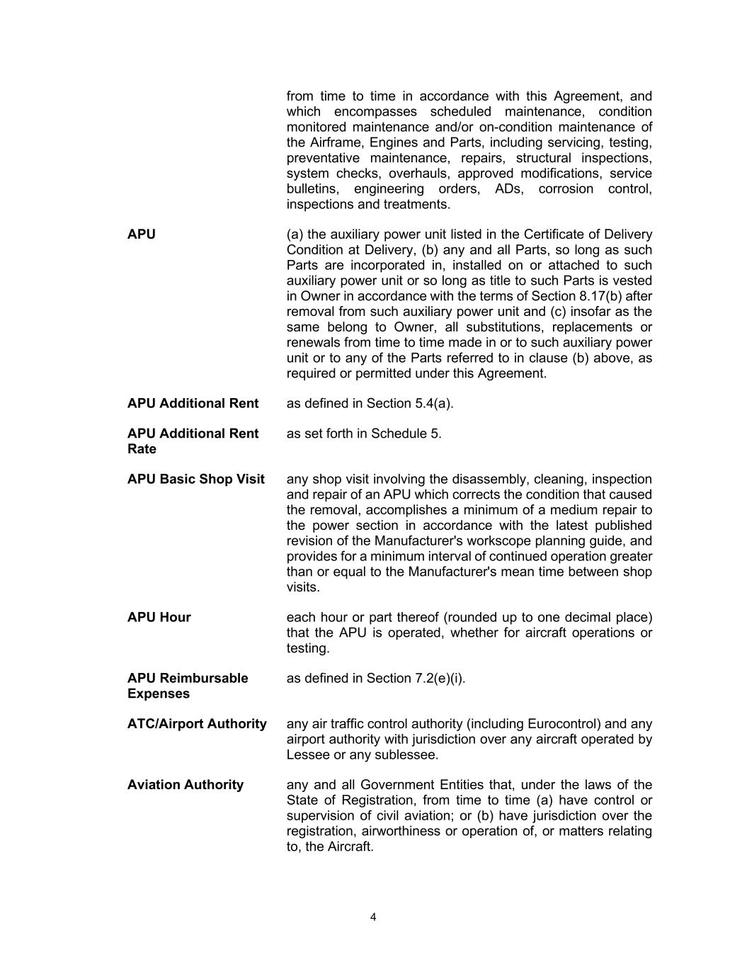 4 from time to time in accordance with this Agreement, and which encompasses scheduled maintenance, condition monitored maintenance and/or on-condition maintenance of the Airframe, Engines and Parts, including servicing, testing, preventative maintenance, repairs, structural inspections, system checks, overhauls, approved modifications, service bulletins, engineering orders, ADs, corrosion control, inspections and treatments. APU (a) the auxiliary power unit listed in the Certificate of Delivery Condition at Delivery, (b) any and all Parts, so long as such Parts are incorporated in, installed on or attached to such auxiliary power unit or so long as title to such Parts is vested in Owner in accordance with the terms of Section 8.17(b) after removal from such auxiliary power unit and (c) insofar as the same belong to Owner, all substitutions, replacements or renewals from time to time made in or to such auxiliary power unit or to any of the Parts referred to in clause (b) above, as required or permitted under this Agreement. APU Additional Rent as defined in Section 5.4(a). APU Additional Rent Rate as set forth in Schedule 5. APU Basic Shop Visit any shop visit involving the disassembly, cleaning, inspection and repair of an APU which corrects the condition that caused the removal, accomplishes a minimum of a medium repair to the power section in accordance with the latest published revision of the Manufacturer's workscope planning guide, and provides for a minimum interval of continued operation greater than or equal to the Manufacturer's mean time between shop visits. APU Hour each hour or part thereof (rounded up to one decimal place) that the APU is operated, whether for aircraft operations or testing. APU Reimbursable Expenses as defined in Section 7.2(e)(i). ATC/Airport Authority any air traffic control authority (including Eurocontrol) and any airport authority with jurisdiction over any aircraft operated by Lessee or any sublessee. Aviation Authority any and all Government Entities that, under the laws of the State of Registration, from time to time (a) have control or supervision of civil aviation; or (b) have jurisdiction over the registration, airworthiness or operation of, or matters relating to, the Aircraft.