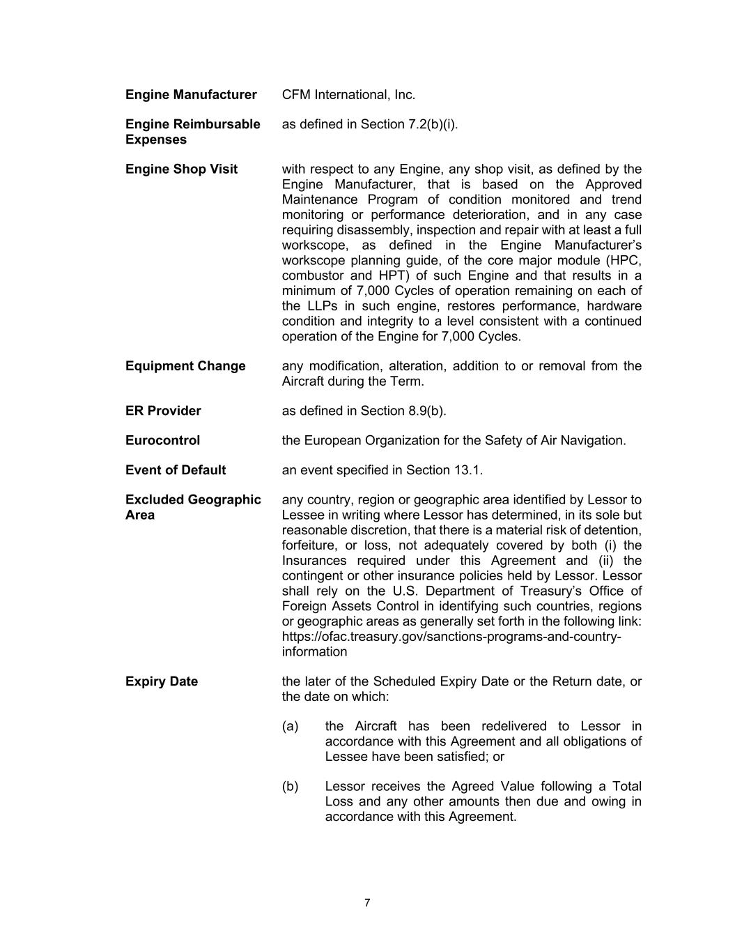 7 Engine Manufacturer CFM International, Inc. Engine Reimbursable Expenses as defined in Section 7.2(b)(i). Engine Shop Visit with respect to any Engine, any shop visit, as defined by the Engine Manufacturer, that is based on the Approved Maintenance Program of condition monitored and trend monitoring or performance deterioration, and in any case requiring disassembly, inspection and repair with at least a full workscope, as defined in the Engine Manufacturer’s workscope planning guide, of the core major module (HPC, combustor and HPT) of such Engine and that results in a minimum of 7,000 Cycles of operation remaining on each of the LLPs in such engine, restores performance, hardware condition and integrity to a level consistent with a continued operation of the Engine for 7,000 Cycles. Equipment Change any modification, alteration, addition to or removal from the Aircraft during the Term. ER Provider as defined in Section 8.9(b). Eurocontrol the European Organization for the Safety of Air Navigation. Event of Default an event specified in Section 13.1. Excluded Geographic Area any country, region or geographic area identified by Lessor to Lessee in writing where Lessor has determined, in its sole but reasonable discretion, that there is a material risk of detention, forfeiture, or loss, not adequately covered by both (i) the Insurances required under this Agreement and (ii) the contingent or other insurance policies held by Lessor. Lessor shall rely on the U.S. Department of Treasury’s Office of Foreign Assets Control in identifying such countries, regions or geographic areas as generally set forth in the following link: https://ofac.treasury.gov/sanctions-programs-and-country- information Expiry Date the later of the Scheduled Expiry Date or the Return date, or the date on which: (a) the Aircraft has been redelivered to Lessor in accordance with this Agreement and all obligations of Lessee have been satisfied; or (b) Lessor receives the Agreed Value following a Total Loss and any other amounts then due and owing in accordance with this Agreement.