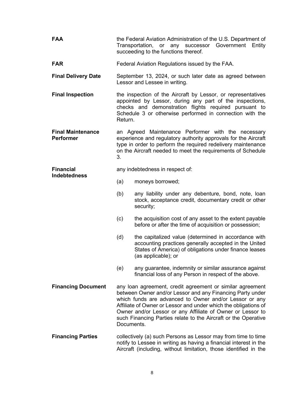 8 FAA the Federal Aviation Administration of the U.S. Department of Transportation, or any successor Government Entity succeeding to the functions thereof. FAR Federal Aviation Regulations issued by the FAA. Final Delivery Date September 13, 2024, or such later date as agreed between Lessor and Lessee in writing. Final Inspection the inspection of the Aircraft by Lessor, or representatives appointed by Lessor, during any part of the inspections, checks and demonstration flights required pursuant to Schedule 3 or otherwise performed in connection with the Return. Final Maintenance Performer an Agreed Maintenance Performer with the necessary experience and regulatory authority approvals for the Aircraft type in order to perform the required redelivery maintenance on the Aircraft needed to meet the requirements of Schedule 3. Financial Indebtedness any indebtedness in respect of: (a) moneys borrowed; (b) any liability under any debenture, bond, note, loan stock, acceptance credit, documentary credit or other security; (c) the acquisition cost of any asset to the extent payable before or after the time of acquisition or possession; (d) the capitalized value (determined in accordance with accounting practices generally accepted in the United States of America) of obligations under finance leases (as applicable); or (e) any guarantee, indemnity or similar assurance against financial loss of any Person in respect of the above. Financing Document any loan agreement, credit agreement or similar agreement between Owner and/or Lessor and any Financing Party under which funds are advanced to Owner and/or Lessor or any Affiliate of Owner or Lessor and under which the obligations of Owner and/or Lessor or any Affiliate of Owner or Lessor to such Financing Parties relate to the Aircraft or the Operative Documents. Financing Parties collectively (a) such Persons as Lessor may from time to time notify to Lessee in writing as having a financial interest in the Aircraft (including, without limitation, those identified in the