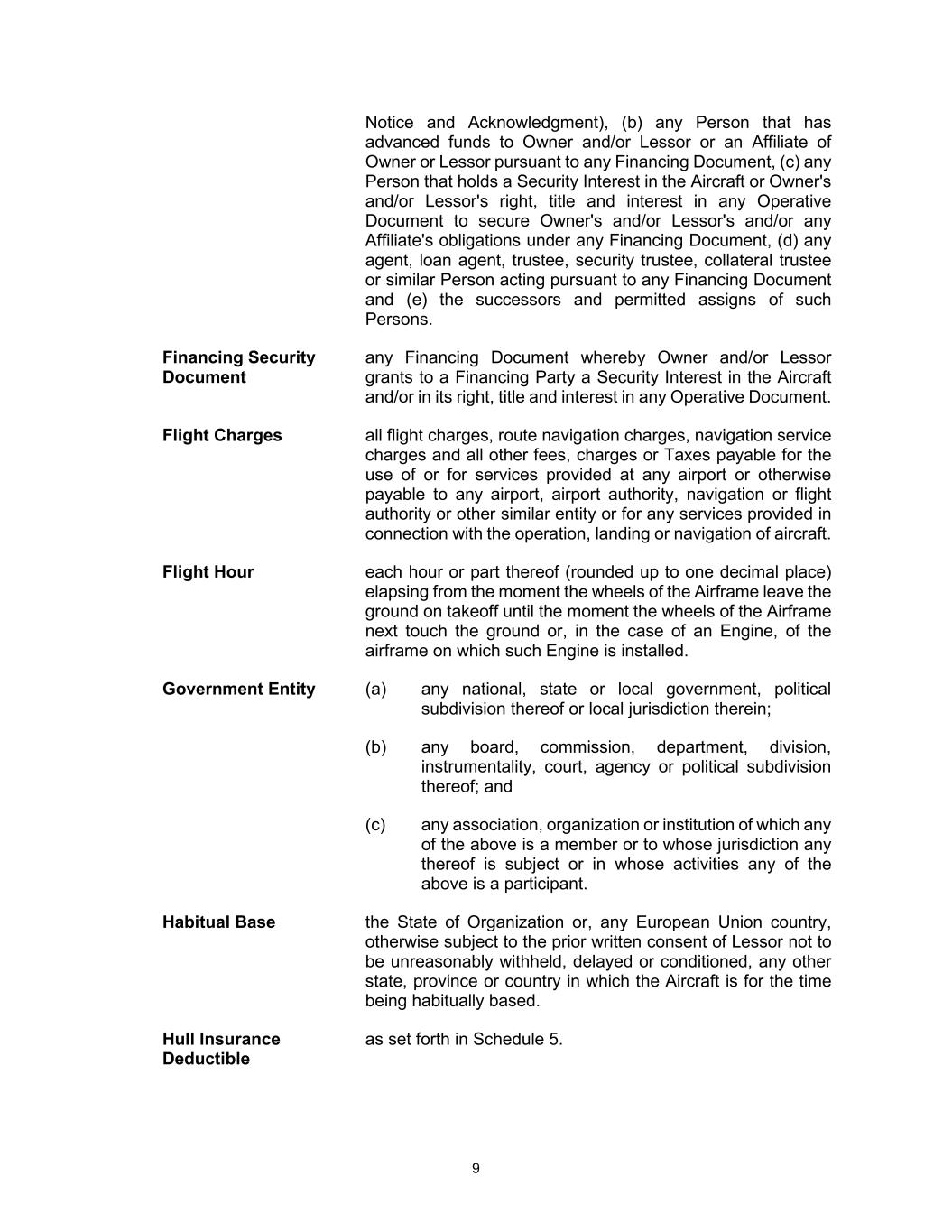 9 Notice and Acknowledgment), (b) any Person that has advanced funds to Owner and/or Lessor or an Affiliate of Owner or Lessor pursuant to any Financing Document, (c) any Person that holds a Security Interest in the Aircraft or Owner's and/or Lessor's right, title and interest in any Operative Document to secure Owner's and/or Lessor's and/or any Affiliate's obligations under any Financing Document, (d) any agent, loan agent, trustee, security trustee, collateral trustee or similar Person acting pursuant to any Financing Document and (e) the successors and permitted assigns of such Persons. Financing Security Document any Financing Document whereby Owner and/or Lessor grants to a Financing Party a Security Interest in the Aircraft and/or in its right, title and interest in any Operative Document. Flight Charges all flight charges, route navigation charges, navigation service charges and all other fees, charges or Taxes payable for the use of or for services provided at any airport or otherwise payable to any airport, airport authority, navigation or flight authority or other similar entity or for any services provided in connection with the operation, landing or navigation of aircraft. Flight Hour each hour or part thereof (rounded up to one decimal place) elapsing from the moment the wheels of the Airframe leave the ground on takeoff until the moment the wheels of the Airframe next touch the ground or, in the case of an Engine, of the airframe on which such Engine is installed. Government Entity (a) any national, state or local government, political subdivision thereof or local jurisdiction therein; (b) any board, commission, department, division, instrumentality, court, agency or political subdivision thereof; and (c) any association, organization or institution of which any of the above is a member or to whose jurisdiction any thereof is subject or in whose activities any of the above is a participant. Habitual Base the State of Organization or, any European Union country, otherwise subject to the prior written consent of Lessor not to be unreasonably withheld, delayed or conditioned, any other state, province or country in which the Aircraft is for the time being habitually based. Hull Insurance Deductible as set forth in Schedule 5.