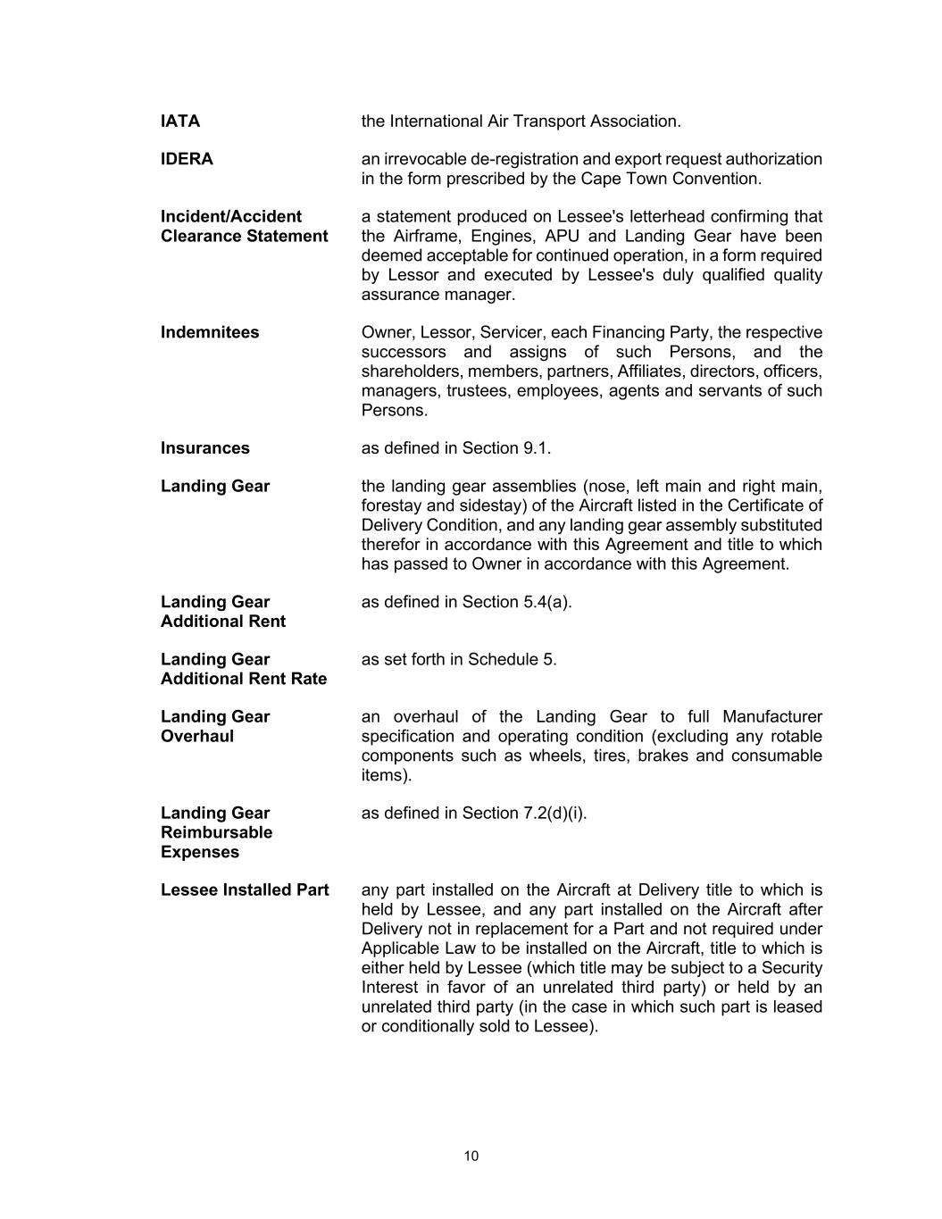 10 IATA the International Air Transport Association. IDERA an irrevocable de-registration and export request authorization in the form prescribed by the Cape Town Convention. Incident/Accident Clearance Statement a statement produced on Lessee's letterhead confirming that the Airframe, Engines, APU and Landing Gear have been deemed acceptable for continued operation, in a form required by Lessor and executed by Lessee's duly qualified quality assurance manager. Indemnitees Owner, Lessor, Servicer, each Financing Party, the respective successors and assigns of such Persons, and the shareholders, members, partners, Affiliates, directors, officers, managers, trustees, employees, agents and servants of such Persons. Insurances as defined in Section 9.1. Landing Gear the landing gear assemblies (nose, left main and right main, forestay and sidestay) of the Aircraft listed in the Certificate of Delivery Condition, and any landing gear assembly substituted therefor in accordance with this Agreement and title to which has passed to Owner in accordance with this Agreement. Landing Gear Additional Rent as defined in Section 5.4(a). Landing Gear Additional Rent Rate as set forth in Schedule 5. Landing Gear Overhaul an overhaul of the Landing Gear to full Manufacturer specification and operating condition (excluding any rotable components such as wheels, tires, brakes and consumable items). Landing Gear Reimbursable Expenses as defined in Section 7.2(d)(i). Lessee Installed Part any part installed on the Aircraft at Delivery title to which is held by Lessee, and any part installed on the Aircraft after Delivery not in replacement for a Part and not required under Applicable Law to be installed on the Aircraft, title to which is either held by Lessee (which title may be subject to a Security Interest in favor of an unrelated third party) or held by an unrelated third party (in the case in which such part is leased or conditionally sold to Lessee).
