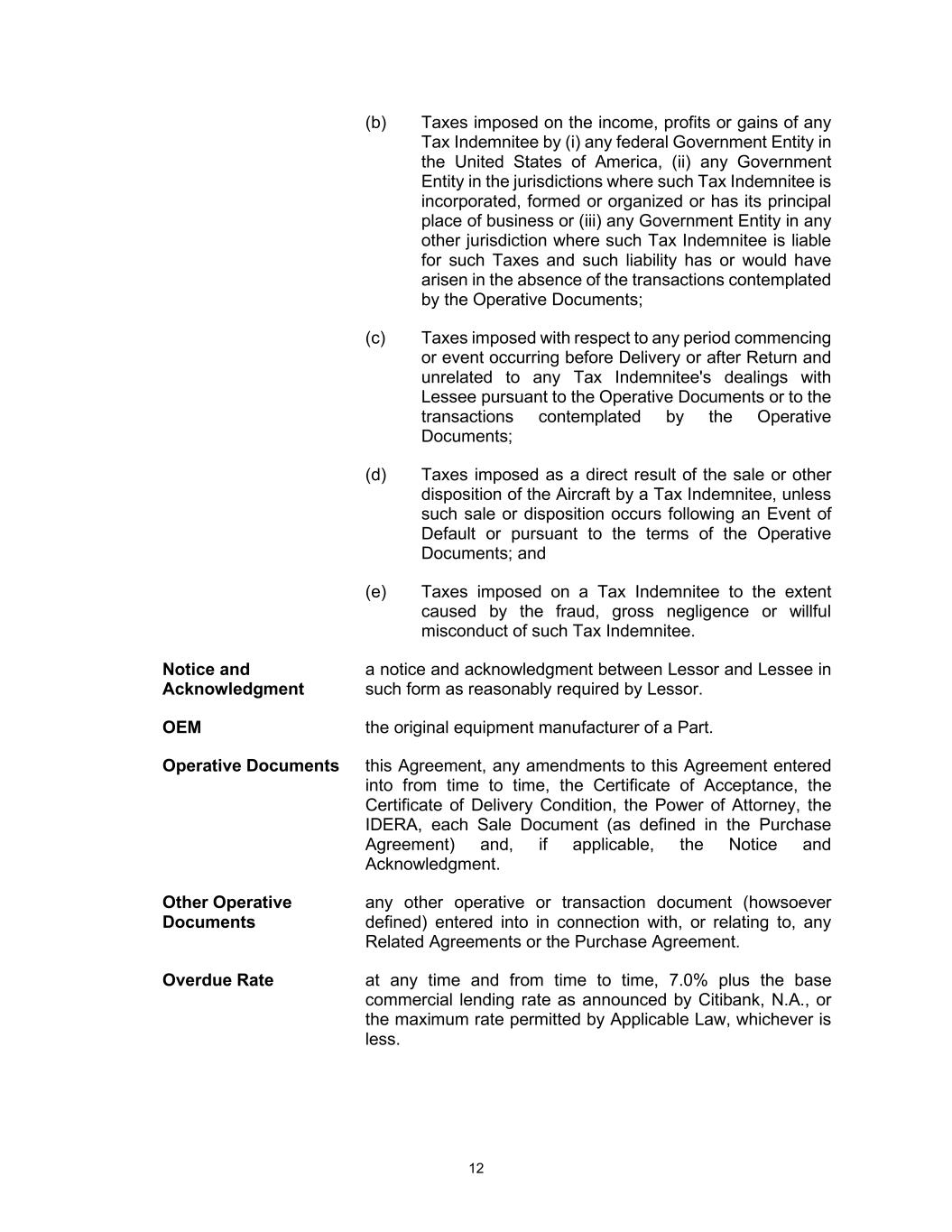 12 (b) Taxes imposed on the income, profits or gains of any Tax Indemnitee by (i) any federal Government Entity in the United States of America, (ii) any Government Entity in the jurisdictions where such Tax Indemnitee is incorporated, formed or organized or has its principal place of business or (iii) any Government Entity in any other jurisdiction where such Tax Indemnitee is liable for such Taxes and such liability has or would have arisen in the absence of the transactions contemplated by the Operative Documents; (c) Taxes imposed with respect to any period commencing or event occurring before Delivery or after Return and unrelated to any Tax Indemnitee's dealings with Lessee pursuant to the Operative Documents or to the transactions contemplated by the Operative Documents; (d) Taxes imposed as a direct result of the sale or other disposition of the Aircraft by a Tax Indemnitee, unless such sale or disposition occurs following an Event of Default or pursuant to the terms of the Operative Documents; and (e) Taxes imposed on a Tax Indemnitee to the extent caused by the fraud, gross negligence or willful misconduct of such Tax Indemnitee. Notice and Acknowledgment a notice and acknowledgment between Lessor and Lessee in such form as reasonably required by Lessor. OEM the original equipment manufacturer of a Part. Operative Documents this Agreement, any amendments to this Agreement entered into from time to time, the Certificate of Acceptance, the Certificate of Delivery Condition, the Power of Attorney, the IDERA, each Sale Document (as defined in the Purchase Agreement) and, if applicable, the Notice and Acknowledgment. Other Operative Documents any other operative or transaction document (howsoever defined) entered into in connection with, or relating to, any Related Agreements or the Purchase Agreement. Overdue Rate at any time and from time to time, 7.0% plus the base commercial lending rate as announced by Citibank, N.A., or the maximum rate permitted by Applicable Law, whichever is less.