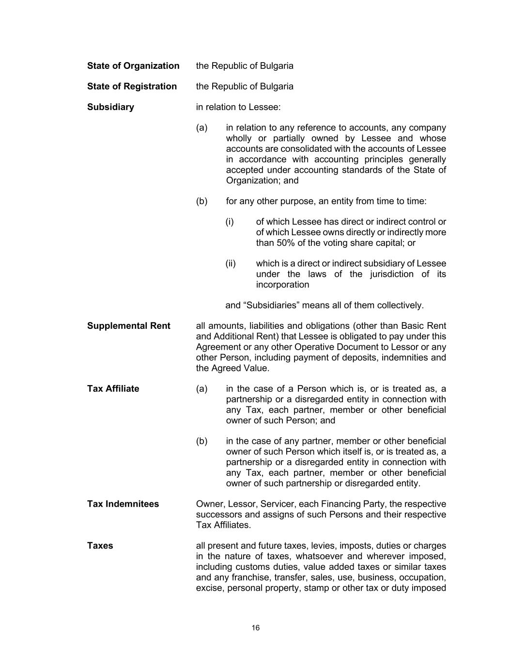 16 State of Organization the Republic of Bulgaria State of Registration the Republic of Bulgaria Subsidiary in relation to Lessee: (a) in relation to any reference to accounts, any company wholly or partially owned by Lessee and whose accounts are consolidated with the accounts of Lessee in accordance with accounting principles generally accepted under accounting standards of the State of Organization; and (b) for any other purpose, an entity from time to time: (i) of which Lessee has direct or indirect control or of which Lessee owns directly or indirectly more than 50% of the voting share capital; or (ii) which is a direct or indirect subsidiary of Lessee under the laws of the jurisdiction of its incorporation and “Subsidiaries” means all of them collectively. Supplemental Rent all amounts, liabilities and obligations (other than Basic Rent and Additional Rent) that Lessee is obligated to pay under this Agreement or any other Operative Document to Lessor or any other Person, including payment of deposits, indemnities and the Agreed Value. Tax Affiliate (a) in the case of a Person which is, or is treated as, a partnership or a disregarded entity in connection with any Tax, each partner, member or other beneficial owner of such Person; and (b) in the case of any partner, member or other beneficial owner of such Person which itself is, or is treated as, a partnership or a disregarded entity in connection with any Tax, each partner, member or other beneficial owner of such partnership or disregarded entity. Tax Indemnitees Owner, Lessor, Servicer, each Financing Party, the respective successors and assigns of such Persons and their respective Tax Affiliates. Taxes all present and future taxes, levies, imposts, duties or charges in the nature of taxes, whatsoever and wherever imposed, including customs duties, value added taxes or similar taxes and any franchise, transfer, sales, use, business, occupation, excise, personal property, stamp or other tax or duty imposed