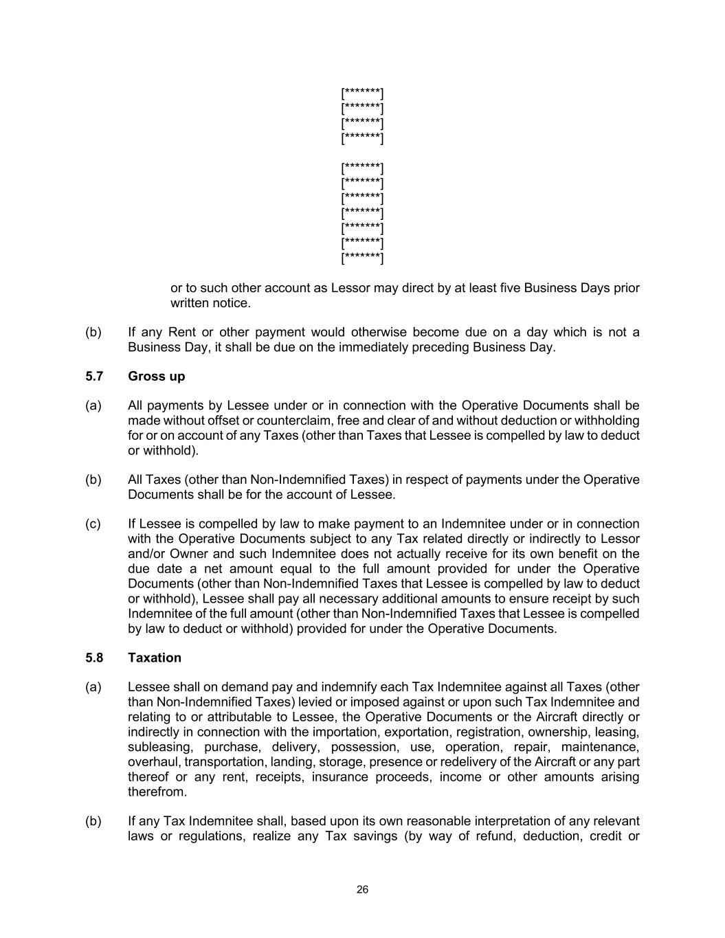 26 [*******] [*******] [*******] [*******] [*******] [*******] [*******] [*******] [*******] Send payment detail to: [*******] or to such other account as Lessor may direct by at least five Business Days prior written notice. (b) If any Rent or other payment would otherwise become due on a day which is not a Business Day, it shall be due on the immediately preceding Business Day. 5.7 Gross up (a) All payments by Lessee under or in connection with the Operative Documents shall be made without offset or counterclaim, free and clear of and without deduction or withholding for or on account of any Taxes (other than Taxes that Lessee is compelled by law to deduct or withhold). (b) All Taxes (other than Non-Indemnified Taxes) in respect of payments under the Operative Documents shall be for the account of Lessee. (c) If Lessee is compelled by law to make payment to an Indemnitee under or in connection with the Operative Documents subject to any Tax related directly or indirectly to Lessor and/or Owner and such Indemnitee does not actually receive for its own benefit on the due date a net amount equal to the full amount provided for under the Operative Documents (other than Non-Indemnified Taxes that Lessee is compelled by law to deduct or withhold), Lessee shall pay all necessary additional amounts to ensure receipt by such Indemnitee of the full amount (other than Non-Indemnified Taxes that Lessee is compelled by law to deduct or withhold) provided for under the Operative Documents. 5.8 Taxation (a) Lessee shall on demand pay and indemnify each Tax Indemnitee against all Taxes (other than Non-Indemnified Taxes) levied or imposed against or upon such Tax Indemnitee and relating to or attributable to Lessee, the Operative Documents or the Aircraft directly or indirectly in connection with the importation, exportation, registration, ownership, leasing, subleasing, purchase, delivery, possession, use, operation, repair, maintenance, overhaul, transportation, landing, storage, presence or redelivery of the Aircraft or any part thereof or any rent, receipts, insurance proceeds, income or other amounts arising therefrom. (b) If any Tax Indemnitee shall, based upon its own reasonable interpretation of any relevant laws or regulations, realize any Tax savings (by way of refund, deduction, credit or otherwise) in respect of any amount with respect to which Lessee shall have made a