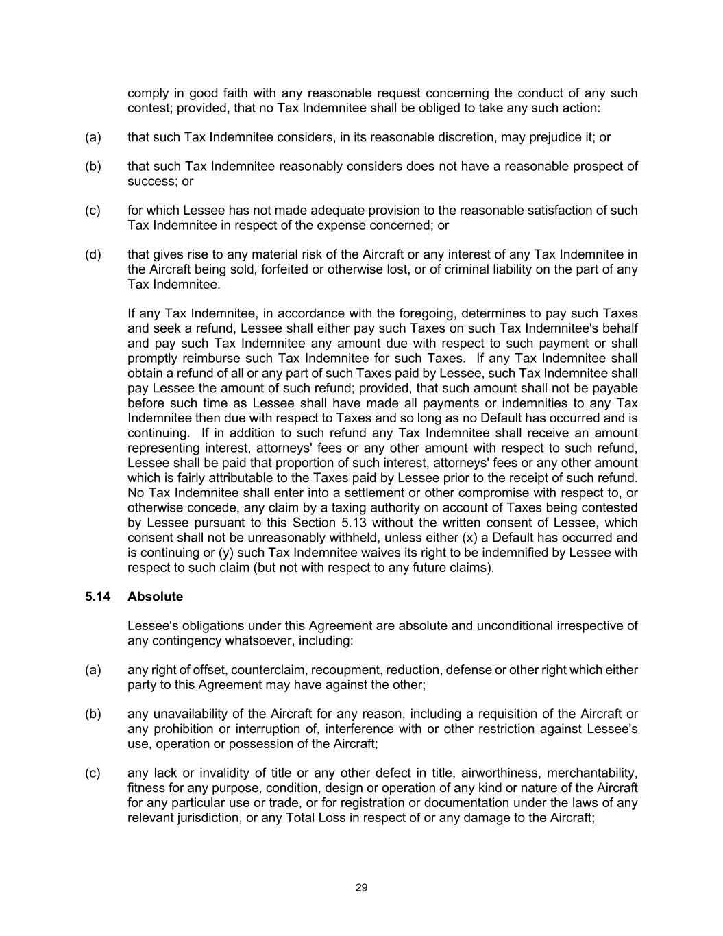 29 (a) that such Tax Indemnitee considers, in its reasonable discretion, may prejudice it; or (b) that such Tax Indemnitee reasonably considers does not have a reasonable prospect of success; or (c) for which Lessee has not made adequate provision to the reasonable satisfaction of such Tax Indemnitee in respect of the expense concerned; or (d) that gives rise to any material risk of the Aircraft or any interest of any Tax Indemnitee in the Aircraft being sold, forfeited or otherwise lost, or of criminal liability on the part of any Tax Indemnitee. If any Tax Indemnitee, in accordance with the foregoing, determines to pay such Taxes and seek a refund, Lessee shall either pay such Taxes on such Tax Indemnitee's behalf and pay such Tax Indemnitee any amount due with respect to such payment or shall promptly reimburse such Tax Indemnitee for such Taxes. If any Tax Indemnitee shall obtain a refund of all or any part of such Taxes paid by Lessee, such Tax Indemnitee shall pay Lessee the amount of such refund; provided, that such amount shall not be payable before such time as Lessee shall have made all payments or indemnities to any Tax Indemnitee then due with respect to Taxes and so long as no Default has occurred and is continuing. If in addition to such refund any Tax Indemnitee shall receive an amount representing interest, attorneys' fees or any other amount with respect to such refund, Lessee shall be paid that proportion of such interest, attorneys' fees or any other amount which is fairly attributable to the Taxes paid by Lessee prior to the receipt of such refund. No Tax Indemnitee shall enter into a settlement or other compromise with respect to, or otherwise concede, any claim by a taxing authority on account of Taxes being contested by Lessee pursuant to this Section 5.13 without the written consent of Lessee, which consent shall not be unreasonably withheld, unless either (x) a Default has occurred and is continuing or (y) such Tax Indemnitee waives its right to be indemnified by Lessee with respect to such claim (but not with respect to any future claims). 5.14 Absolute Lessee's obligations under this Agreement are absolute and unconditional irrespective of any contingency whatsoever, including: (a) any right of offset, counterclaim, recoupment, reduction, defense or other right which either party to this Agreement may have against the other; (b) any unavailability of the Aircraft for any reason, including a requisition of the Aircraft or any prohibition or interruption of, interference with or other restriction against Lessee's use, operation or possession of the Aircraft; (c) any lack or invalidity of title or any other defect in title, airworthiness, merchantability, fitness for any purpose, condition, design or operation of any kind or nature of the Aircraft for any particular use or trade, or for registration or documentation under the laws of any relevant jurisdiction, or any Total Loss in respect of or any damage to the Aircraft; (d) any insolvency, bankruptcy, reorganization, arrangement, readjustment of debt, dissolution, liquidation or similar proceedings by or against Lessor or Lessee;
