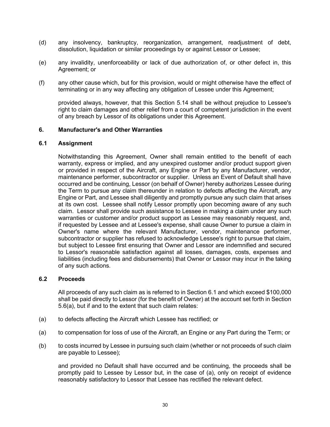 30 (e) any invalidity, unenforceability or lack of due authorization of, or other defect in, this Agreement; or (f) any other cause which, but for this provision, would or might otherwise have the effect of terminating or in any way affecting any obligation of Lessee under this Agreement; provided always, however, that this Section 5.14 shall be without prejudice to Lessee's right to claim damages and other relief from a court of competent jurisdiction in the event of any breach by Lessor of its obligations under this Agreement. 6. Manufacturer's and Other Warranties 6.1 Assignment Notwithstanding this Agreement, Owner shall remain entitled to the benefit of each warranty, express or implied, and any unexpired customer and/or product support given or provided in respect of the Aircraft, any Engine or Part by any Manufacturer, vendor, maintenance performer, subcontractor or supplier. Unless an Event of Default shall have occurred and be continuing, Lessor (on behalf of Owner) hereby authorizes Lessee during the Term to pursue any claim thereunder in relation to defects affecting the Aircraft, any Engine or Part, and Lessee shall diligently and promptly pursue any such claim that arises at its own cost. Lessee shall notify Lessor promptly upon becoming aware of any such claim. Lessor shall provide such assistance to Lessee in making a claim under any such warranties or customer and/or product support as Lessee may reasonably request, and, if requested by Lessee and at Lessee's expense, shall cause Owner to pursue a claim in Owner's name where the relevant Manufacturer, vendor, maintenance performer, subcontractor or supplier has refused to acknowledge Lessee's right to pursue that claim, but subject to Lessee first ensuring that Owner and Lessor are indemnified and secured to Lessor's reasonable satisfaction against all losses, damages, costs, expenses and liabilities (including fees and disbursements) that Owner or Lessor may incur in the taking of any such actions. 6.2 Proceeds All proceeds of any such claim as is referred to in Section 6.1 and which exceed $100,000 shall be paid directly to Lessor (for the benefit of Owner) at the account set forth in Section 5.6(a), but if and to the extent that such claim relates: (a) to defects affecting the Aircraft which Lessee has rectified; or (a) to compensation for loss of use of the Aircraft, an Engine or any Part during the Term; or (b) to costs incurred by Lessee in pursuing such claim (whether or not proceeds of such claim are payable to Lessee); and provided no Default shall have occurred and be continuing, the proceeds shall be promptly paid to Lessee by Lessor but, in the case of (a), only on receipt of evidence reasonably satisfactory to Lessor that Lessee has rectified the relevant defect.