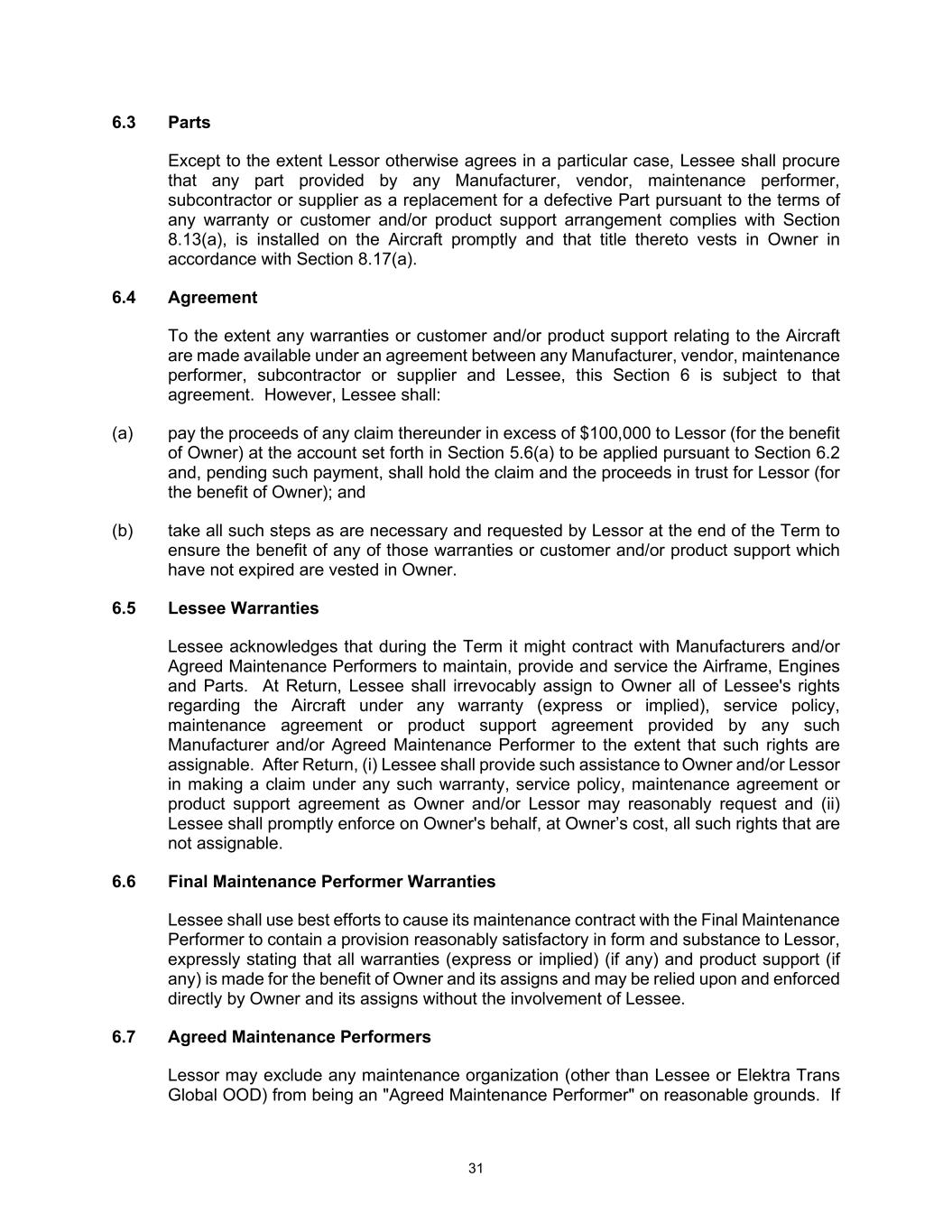 31 6.3 Parts Except to the extent Lessor otherwise agrees in a particular case, Lessee shall procure that any part provided by any Manufacturer, vendor, maintenance performer, subcontractor or supplier as a replacement for a defective Part pursuant to the terms of any warranty or customer and/or product support arrangement complies with Section 8.13(a), is installed on the Aircraft promptly and that title thereto vests in Owner in accordance with Section 8.17(a). 6.4 Agreement To the extent any warranties or customer and/or product support relating to the Aircraft are made available under an agreement between any Manufacturer, vendor, maintenance performer, subcontractor or supplier and Lessee, this Section 6 is subject to that agreement. However, Lessee shall: (a) pay the proceeds of any claim thereunder in excess of $100,000 to Lessor (for the benefit of Owner) at the account set forth in Section 5.6(a) to be applied pursuant to Section 6.2 and, pending such payment, shall hold the claim and the proceeds in trust for Lessor (for the benefit of Owner); and (b) take all such steps as are necessary and requested by Lessor at the end of the Term to ensure the benefit of any of those warranties or customer and/or product support which have not expired are vested in Owner. 6.5 Lessee Warranties Lessee acknowledges that during the Term it might contract with Manufacturers and/or Agreed Maintenance Performers to maintain, provide and service the Airframe, Engines and Parts. At Return, Lessee shall irrevocably assign to Owner all of Lessee's rights regarding the Aircraft under any warranty (express or implied), service policy, maintenance agreement or product support agreement provided by any such Manufacturer and/or Agreed Maintenance Performer to the extent that such rights are assignable. After Return, (i) Lessee shall provide such assistance to Owner and/or Lessor in making a claim under any such warranty, service policy, maintenance agreement or product support agreement as Owner and/or Lessor may reasonably request and (ii) Lessee shall promptly enforce on Owner's behalf, at Owner’s cost, all such rights that are not assignable. 6.6 Final Maintenance Performer Warranties Lessee shall use best efforts to cause its maintenance contract with the Final Maintenance Performer to contain a provision reasonably satisfactory in form and substance to Lessor, expressly stating that all warranties (express or implied) (if any) and product support (if any) is made for the benefit of Owner and its assigns and may be relied upon and enforced directly by Owner and its assigns without the involvement of Lessee. 6.7 Agreed Maintenance Performers Lessor may exclude any maintenance organization (other than Lessee or Elektra Trans Global OOD) from being an "Agreed Maintenance Performer" on reasonable grounds. If