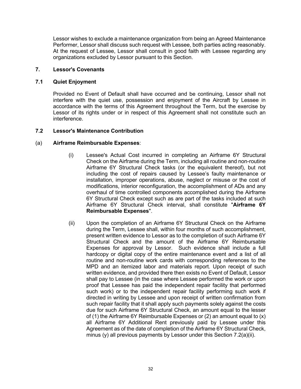 32 Lessor wishes to exclude a maintenance organization from being an Agreed Maintenance Performer, Lessor shall discuss such request with Lessee, both parties acting reasonably. At the request of Lessee, Lessor shall consult in good faith with Lessee regarding any organizations excluded by Lessor pursuant to this Section. 7. Lessor's Covenants 7.1 Quiet Enjoyment Provided no Event of Default shall have occurred and be continuing, Lessor shall not interfere with the quiet use, possession and enjoyment of the Aircraft by Lessee in accordance with the terms of this Agreement throughout the Term, but the exercise by Lessor of its rights under or in respect of this Agreement shall not constitute such an interference. 7.2 Lessor's Maintenance Contribution (a) Airframe Reimbursable Expenses: (i) Lessee's Actual Cost incurred in completing an Airframe 6Y Structural Check on the Airframe during the Term, including all routine and non-routine Airframe 6Y Structural Check tasks (or the equivalent thereof), but not including the cost of repairs caused by Lessee’s faulty maintenance or installation, improper operations, abuse, neglect or misuse or the cost of modifications, interior reconfiguration, the accomplishment of ADs and any overhaul of time controlled components accomplished during the Airframe 6Y Structural Check except such as are part of the tasks included at such Airframe 6Y Structural Check interval, shall constitute "Airframe 6Y Reimbursable Expenses". (ii) Upon the completion of an Airframe 6Y Structural Check on the Airframe during the Term, Lessee shall, within four months of such accomplishment, present written evidence to Lessor as to the completion of such Airframe 6Y Structural Check and the amount of the Airframe 6Y Reimbursable Expenses for approval by Lessor. Such evidence shall include a full hardcopy or digital copy of the entire maintenance event and a list of all routine and non-routine work cards with corresponding references to the MPD and an itemized labor and materials report. Upon receipt of such written evidence, and provided there then exists no Event of Default, Lessor shall pay to Lessee (in the case where Lessee performed the work or upon proof that Lessee has paid the independent repair facility that performed such work) or to the independent repair facility performing such work if directed in writing by Lessee and upon receipt of written confirmation from such repair facility that it shall apply such payments solely against the costs due for such Airframe 6Y Structural Check, an amount equal to the lesser of (1) the Airframe 6Y Reimbursable Expenses or (2) an amount equal to (x) all Airframe 6Y Additional Rent previously paid by Lessee under this Agreement as of the date of completion of the Airframe 6Y Structural Check, minus (y) all previous payments by Lessor under this Section 7.2(a)(ii).
