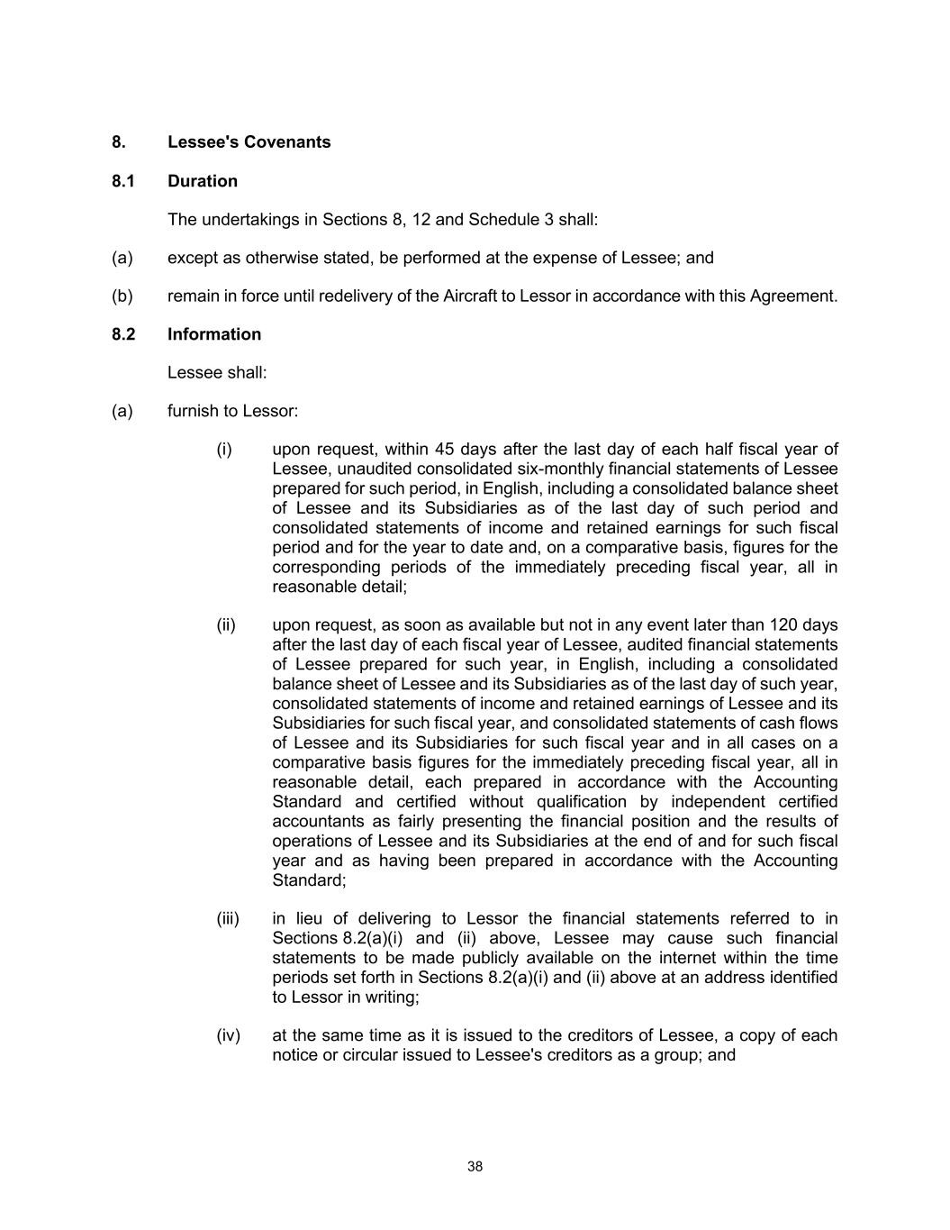 38 8. Lessee's Covenants 8.1 Duration The undertakings in Sections 8, 12 and Schedule 3 shall: (a) except as otherwise stated, be performed at the expense of Lessee; and (b) remain in force until redelivery of the Aircraft to Lessor in accordance with this Agreement. 8.2 Information Lessee shall: (a) furnish to Lessor: (i) upon request, within 45 days after the last day of each half fiscal year of Lessee, unaudited consolidated six-monthly financial statements of Lessee prepared for such period, in English, including a consolidated balance sheet of Lessee and its Subsidiaries as of the last day of such period and consolidated statements of income and retained earnings for such fiscal period and for the year to date and, on a comparative basis, figures for the corresponding periods of the immediately preceding fiscal year, all in reasonable detail; (ii) upon request, as soon as available but not in any event later than 120 days after the last day of each fiscal year of Lessee, audited financial statements of Lessee prepared for such year, in English, including a consolidated balance sheet of Lessee and its Subsidiaries as of the last day of such year, consolidated statements of income and retained earnings of Lessee and its Subsidiaries for such fiscal year, and consolidated statements of cash flows of Lessee and its Subsidiaries for such fiscal year and in all cases on a comparative basis figures for the immediately preceding fiscal year, all in reasonable detail, each prepared in accordance with the Accounting Standard and certified without qualification by independent certified accountants as fairly presenting the financial position and the results of operations of Lessee and its Subsidiaries at the end of and for such fiscal year and as having been prepared in accordance with the Accounting Standard; (iii) in lieu of delivering to Lessor the financial statements referred to in Sections 8.2(a)(i) and (ii) above, Lessee may cause such financial statements to be made publicly available on the internet within the time periods set forth in Sections 8.2(a)(i) and (ii) above at an address identified to Lessor in writing; (iv) at the same time as it is issued to the creditors of Lessee, a copy of each notice or circular issued to Lessee's creditors as a group; and