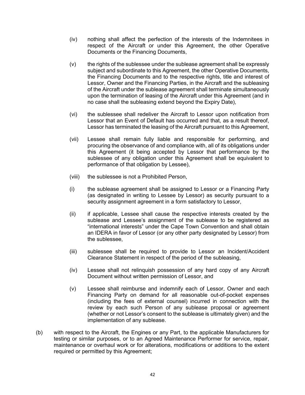 42 (iv) nothing shall affect the perfection of the interests of the Indemnitees in respect of the Aircraft or under this Agreement, the other Operative Documents or the Financing Documents, (v) the rights of the sublessee under the sublease agreement shall be expressly subject and subordinate to this Agreement, the other Operative Documents, the Financing Documents and to the respective rights, title and interest of Lessor, Owner and the Financing Parties, in the Aircraft and the subleasing of the Aircraft under the sublease agreement shall terminate simultaneously upon the termination of leasing of the Aircraft under this Agreement (and in no case shall the subleasing extend beyond the Expiry Date), (vi) the sublessee shall redeliver the Aircraft to Lessor upon notification from Lessor that an Event of Default has occurred and that, as a result thereof, Lessor has terminated the leasing of the Aircraft pursuant to this Agreement, (vii) Lessee shall remain fully liable and responsible for performing, and procuring the observance of and compliance with, all of its obligations under this Agreement (it being accepted by Lessor that performance by the sublessee of any obligation under this Agreement shall be equivalent to performance of that obligation by Lessee), (viii) the sublessee is not a Prohibited Person, (i) the sublease agreement shall be assigned to Lessor or a Financing Party (as designated in writing to Lessee by Lessor) as security pursuant to a security assignment agreement in a form satisfactory to Lessor, (ii) if applicable, Lessee shall cause the respective interests created by the sublease and Lessee’s assignment of the sublease to be registered as “international interests” under the Cape Town Convention and shall obtain an IDERA in favor of Lessor (or any other party designated by Lessor) from the sublessee, (iii) sublessee shall be required to provide to Lessor an Incident/Accident Clearance Statement in respect of the period of the subleasing, (iv) Lessee shall not relinquish possession of any hard copy of any Aircraft Document without written permission of Lessor, and (v) Lessee shall reimburse and indemnify each of Lessor, Owner and each Financing Party on demand for all reasonable out-of-pocket expenses (including the fees of external counsel) incurred in connection with the review by each such Person of any sublease proposal or agreement (whether or not Lessor’s consent to the sublease is ultimately given) and the implementation of any sublease. (b) with respect to the Aircraft, the Engines or any Part, to the applicable Manufacturers for testing or similar purposes, or to an Agreed Maintenance Performer for service, repair, maintenance or overhaul work or for alterations, modifications or additions to the extent required or permitted by this Agreement;