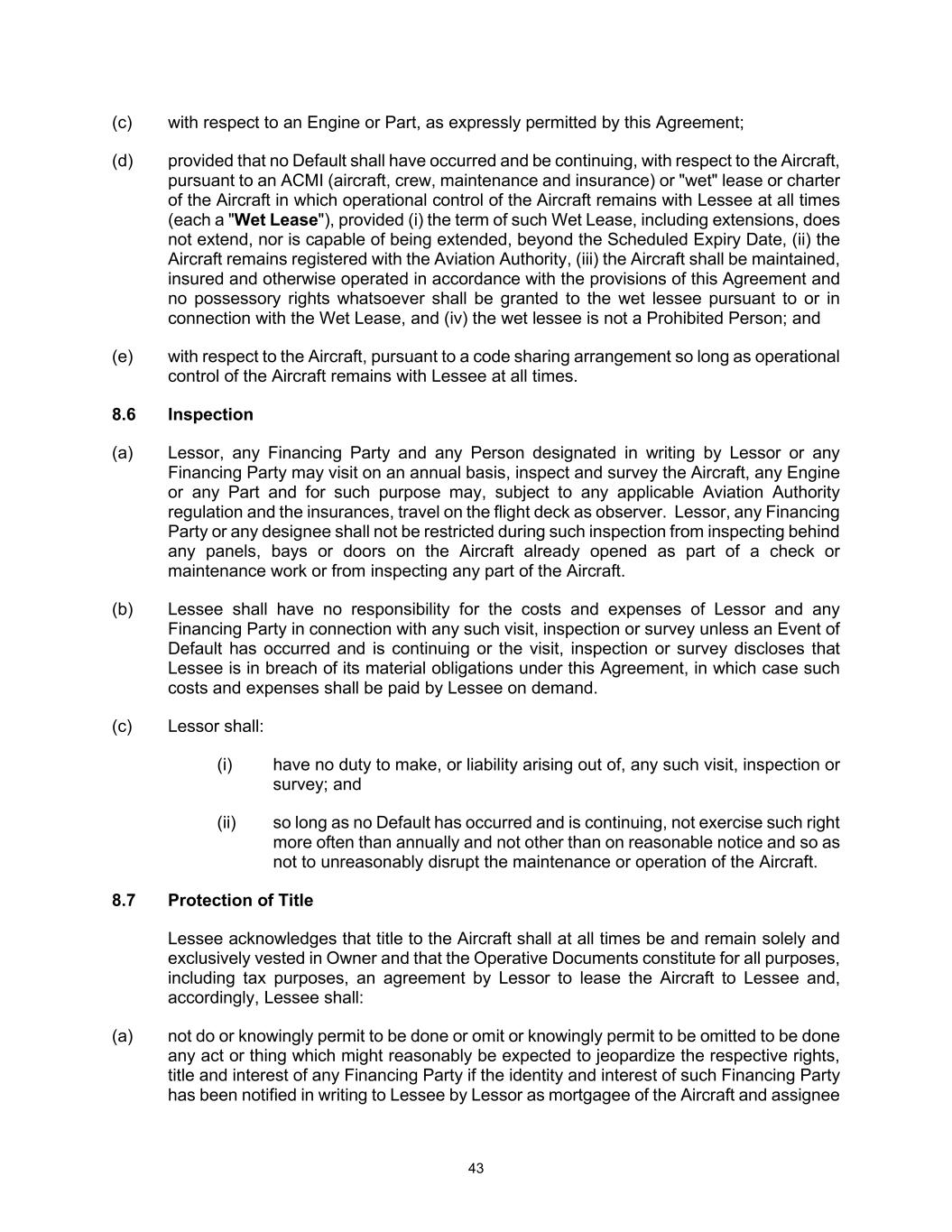 43 (c) with respect to an Engine or Part, as expressly permitted by this Agreement; (d) provided that no Default shall have occurred and be continuing, with respect to the Aircraft, pursuant to an ACMI (aircraft, crew, maintenance and insurance) or "wet" lease or charter of the Aircraft in which operational control of the Aircraft remains with Lessee at all times (each a "Wet Lease"), provided (i) the term of such Wet Lease, including extensions, does not extend, nor is capable of being extended, beyond the Scheduled Expiry Date, (ii) the Aircraft remains registered with the Aviation Authority, (iii) the Aircraft shall be maintained, insured and otherwise operated in accordance with the provisions of this Agreement and no possessory rights whatsoever shall be granted to the wet lessee pursuant to or in connection with the Wet Lease, and (iv) the wet lessee is not a Prohibited Person; and (e) with respect to the Aircraft, pursuant to a code sharing arrangement so long as operational control of the Aircraft remains with Lessee at all times. 8.6 Inspection (a) Lessor, any Financing Party and any Person designated in writing by Lessor or any Financing Party may visit on an annual basis, inspect and survey the Aircraft, any Engine or any Part and for such purpose may, subject to any applicable Aviation Authority regulation and the insurances, travel on the flight deck as observer. Lessor, any Financing Party or any designee shall not be restricted during such inspection from inspecting behind any panels, bays or doors on the Aircraft already opened as part of a check or maintenance work or from inspecting any part of the Aircraft. (b) Lessee shall have no responsibility for the costs and expenses of Lessor and any Financing Party in connection with any such visit, inspection or survey unless an Event of Default has occurred and is continuing or the visit, inspection or survey discloses that Lessee is in breach of its material obligations under this Agreement, in which case such costs and expenses shall be paid by Lessee on demand. (c) Lessor shall: (i) have no duty to make, or liability arising out of, any such visit, inspection or survey; and (ii) so long as no Default has occurred and is continuing, not exercise such right more often than annually and not other than on reasonable notice and so as not to unreasonably disrupt the maintenance or operation of the Aircraft. 8.7 Protection of Title Lessee acknowledges that title to the Aircraft shall at all times be and remain solely and exclusively vested in Owner and that the Operative Documents constitute for all purposes, including tax purposes, an agreement by Lessor to lease the Aircraft to Lessee and, accordingly, Lessee shall: (a) not do or knowingly permit to be done or omit or knowingly permit to be omitted to be done any act or thing which might reasonably be expected to jeopardize the respective rights, title and interest of any Financing Party if the identity and interest of such Financing Party has been notified in writing to Lessee by Lessor as mortgagee of the Aircraft and assignee