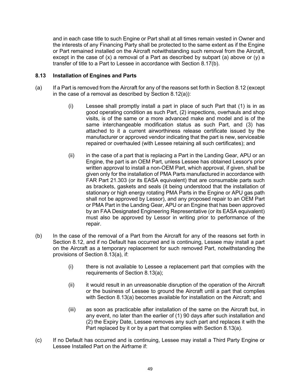 49 and in each case title to such Engine or Part shall at all times remain vested in Owner and the interests of any Financing Party shall be protected to the same extent as if the Engine or Part remained installed on the Aircraft notwithstanding such removal from the Aircraft, except in the case of (x) a removal of a Part as described by subpart (a) above or (y) a transfer of title to a Part to Lessee in accordance with Section 8.17(b). 8.13 Installation of Engines and Parts (a) If a Part is removed from the Aircraft for any of the reasons set forth in Section 8.12 (except in the case of a removal as described by Section 8.12(a)): (i) Lessee shall promptly install a part in place of such Part that (1) is in as good operating condition as such Part, (2) inspections, overhauls and shop visits, is of the same or a more advanced make and model and is of the same interchangeable modification status as such Part, and (3) has attached to it a current airworthiness release certificate issued by the manufacturer or approved vendor indicating that the part is new, serviceable repaired or overhauled (with Lessee retaining all such certificates); and (ii) in the case of a part that is replacing a Part in the Landing Gear, APU or an Engine, the part is an OEM Part, unless Lessee has obtained Lessor's prior written approval to install a non-OEM Part, which approval, if given, shall be given only for the installation of PMA Parts manufactured in accordance with FAR Part 21.303 (or its EASA equivalent) that are consumable parts such as brackets, gaskets and seals (it being understood that the installation of stationary or high energy rotating PMA Parts in the Engine or APU gas path shall not be approved by Lessor), and any proposed repair to an OEM Part or PMA Part in the Landing Gear, APU or an Engine that has been approved by an FAA Designated Engineering Representative (or its EASA equivalent) must also be approved by Lessor in writing prior to performance of the repair. (b) In the case of the removal of a Part from the Aircraft for any of the reasons set forth in Section 8.12, and if no Default has occurred and is continuing, Lessee may install a part on the Aircraft as a temporary replacement for such removed Part, notwithstanding the provisions of Section 8.13(a), if: (i) there is not available to Lessee a replacement part that complies with the requirements of Section 8.13(a); (ii) it would result in an unreasonable disruption of the operation of the Aircraft or the business of Lessee to ground the Aircraft until a part that complies with Section 8.13(a) becomes available for installation on the Aircraft; and (iii) as soon as practicable after installation of the same on the Aircraft but, in any event, no later than the earlier of (1) 90 days after such installation and (2) the Expiry Date, Lessee removes any such part and replaces it with the Part replaced by it or by a part that complies with Section 8.13(a). (c) If no Default has occurred and is continuing, Lessee may install a Third Party Engine or Lessee Installed Part on the Airframe if: