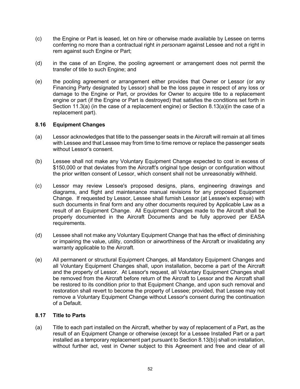 52 (c) the Engine or Part is leased, let on hire or otherwise made available by Lessee on terms conferring no more than a contractual right in personam against Lessee and not a right in rem against such Engine or Part; (d) in the case of an Engine, the pooling agreement or arrangement does not permit the transfer of title to such Engine; and (e) the pooling agreement or arrangement either provides that Owner or Lessor (or any Financing Party designated by Lessor) shall be the loss payee in respect of any loss or damage to the Engine or Part, or provides for Owner to acquire title to a replacement engine or part (if the Engine or Part is destroyed) that satisfies the conditions set forth in Section 11.3(a) (in the case of a replacement engine) or Section 8.13(a)(in the case of a replacement part). 8.16 Equipment Changes (a) Lessor acknowledges that title to the passenger seats in the Aircraft will remain at all times with Lessee and that Lessee may from time to time remove or replace the passenger seats without Lessor’s consent. (b) Lessee shall not make any Voluntary Equipment Change expected to cost in excess of $150,000 or that deviates from the Aircraft's original type design or configuration without the prior written consent of Lessor, which consent shall not be unreasonably withheld. (c) Lessor may review Lessee's proposed designs, plans, engineering drawings and diagrams, and flight and maintenance manual revisions for any proposed Equipment Change. If requested by Lessor, Lessee shall furnish Lessor (at Lessee's expense) with such documents in final form and any other documents required by Applicable Law as a result of an Equipment Change. All Equipment Changes made to the Aircraft shall be properly documented in the Aircraft Documents and be fully approved per EASA requirements. (d) Lessee shall not make any Voluntary Equipment Change that has the effect of diminishing or impairing the value, utility, condition or airworthiness of the Aircraft or invalidating any warranty applicable to the Aircraft. (e) All permanent or structural Equipment Changes, all Mandatory Equipment Changes and all Voluntary Equipment Changes shall, upon installation, become a part of the Aircraft and the property of Lessor. At Lessor's request, all Voluntary Equipment Changes shall be removed from the Aircraft before return of the Aircraft to Lessor and the Aircraft shall be restored to its condition prior to that Equipment Change, and upon such removal and restoration shall revert to become the property of Lessee; provided, that Lessee may not remove a Voluntary Equipment Change without Lessor's consent during the continuation of a Default. 8.17 Title to Parts (a) Title to each part installed on the Aircraft, whether by way of replacement of a Part, as the result of an Equipment Change or otherwise (except for a Lessee Installed Part or a part installed as a temporary replacement part pursuant to Section 8.13(b)) shall on installation, without further act, vest in Owner subject to this Agreement and free and clear of all