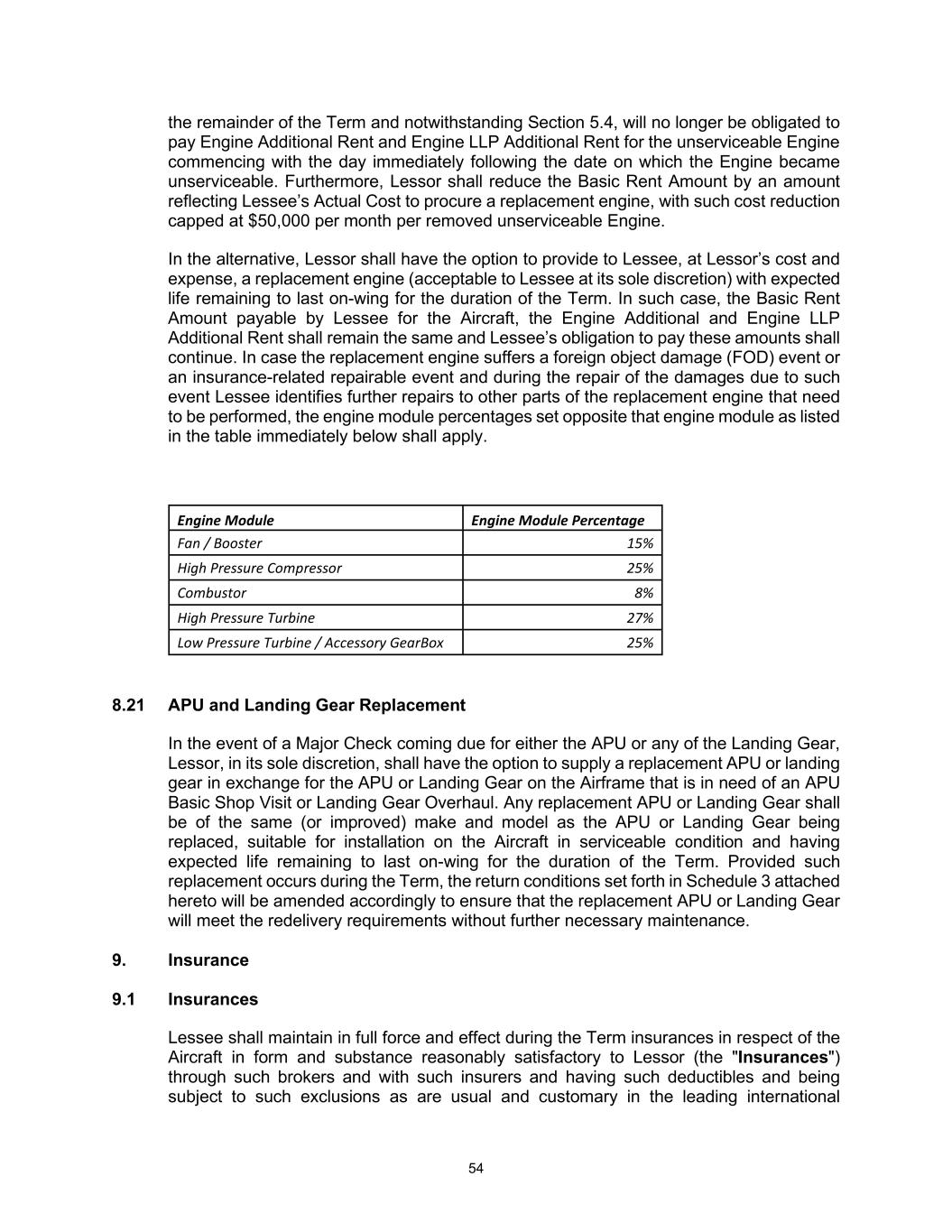54 the remainder of the Term and notwithstanding Section 5.4, will no longer be obligated to pay Engine Additional Rent and Engine LLP Additional Rent for the unserviceable Engine commencing with the day immediately following the date on which the Engine became unserviceable. Furthermore, Lessor shall reduce the Basic Rent Amount by an amount reflecting Lessee’s Actual Cost to procure a replacement engine, with such cost reduction capped at $50,000 per month per removed unserviceable Engine. In the alternative, Lessor shall have the option to provide to Lessee, at Lessor’s cost and expense, a replacement engine (acceptable to Lessee at its sole discretion) with expected life remaining to last on-wing for the duration of the Term. In such case, the Basic Rent Amount payable by Lessee for the Aircraft, the Engine Additional and Engine LLP Additional Rent shall remain the same and Lessee’s obligation to pay these amounts shall continue. In case the replacement engine suffers a foreign object damage (FOD) event or an insurance-related repairable event and during the repair of the damages due to such event Lessee identifies further repairs to other parts of the replacement engine that need to be performed, the engine module percentages set opposite that engine module as listed in the table immediately below shall apply. Engine Module Engine Module Percentage Fan / Booster 15% High Pressure Compressor 25% Combustor 8% High Pressure Turbine 27% Low Pressure Turbine / Accessory GearBox 25% 8.21 APU and Landing Gear Replacement In the event of a Major Check coming due for either the APU or any of the Landing Gear, Lessor, in its sole discretion, shall have the option to supply a replacement APU or landing gear in exchange for the APU or Landing Gear on the Airframe that is in need of an APU Basic Shop Visit or Landing Gear Overhaul. Any replacement APU or Landing Gear shall be of the same (or improved) make and model as the APU or Landing Gear being replaced, suitable for installation on the Aircraft in serviceable condition and having expected life remaining to last on-wing for the duration of the Term. Provided such replacement occurs during the Term, the return conditions set forth in Schedule 3 attached hereto will be amended accordingly to ensure that the replacement APU or Landing Gear will meet the redelivery requirements without further necessary maintenance. 9. Insurance 9.1 Insurances Lessee shall maintain in full force and effect during the Term insurances in respect of the Aircraft in form and substance reasonably satisfactory to Lessor (the "Insurances") through such brokers and with such insurers and having such deductibles and being subject to such exclusions as are usual and customary in the leading international