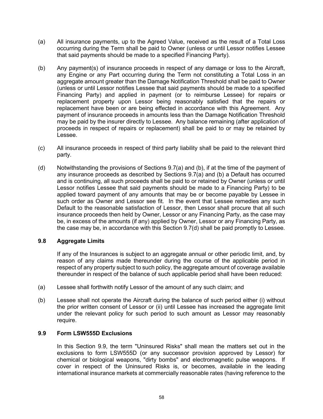 58 (a) All insurance payments, up to the Agreed Value, received as the result of a Total Loss occurring during the Term shall be paid to Owner (unless or until Lessor notifies Lessee that said payments should be made to a specified Financing Party). (b) Any payment(s) of insurance proceeds in respect of any damage or loss to the Aircraft, any Engine or any Part occurring during the Term not constituting a Total Loss in an aggregate amount greater than the Damage Notification Threshold shall be paid to Owner (unless or until Lessor notifies Lessee that said payments should be made to a specified Financing Party) and applied in payment (or to reimburse Lessee) for repairs or replacement property upon Lessor being reasonably satisfied that the repairs or replacement have been or are being effected in accordance with this Agreement. Any payment of insurance proceeds in amounts less than the Damage Notification Threshold may be paid by the insurer directly to Lessee. Any balance remaining (after application of proceeds in respect of repairs or replacement) shall be paid to or may be retained by Lessee. (c) All insurance proceeds in respect of third party liability shall be paid to the relevant third party. (d) Notwithstanding the provisions of Sections 9.7(a) and (b), if at the time of the payment of any insurance proceeds as described by Sections 9.7(a) and (b) a Default has occurred and is continuing, all such proceeds shall be paid to or retained by Owner (unless or until Lessor notifies Lessee that said payments should be made to a Financing Party) to be applied toward payment of any amounts that may be or become payable by Lessee in such order as Owner and Lessor see fit. In the event that Lessee remedies any such Default to the reasonable satisfaction of Lessor, then Lessor shall procure that all such insurance proceeds then held by Owner, Lessor or any Financing Party, as the case may be, in excess of the amounts (if any) applied by Owner, Lessor or any Financing Party, as the case may be, in accordance with this Section 9.7(d) shall be paid promptly to Lessee. 9.8 Aggregate Limits If any of the Insurances is subject to an aggregate annual or other periodic limit, and, by reason of any claims made thereunder during the course of the applicable period in respect of any property subject to such policy, the aggregate amount of coverage available thereunder in respect of the balance of such applicable period shall have been reduced: (a) Lessee shall forthwith notify Lessor of the amount of any such claim; and (b) Lessee shall not operate the Aircraft during the balance of such period either (i) without the prior written consent of Lessor or (ii) until Lessee has increased the aggregate limit under the relevant policy for such period to such amount as Lessor may reasonably require. 9.9 Form LSW555D Exclusions In this Section 9.9, the term "Uninsured Risks" shall mean the matters set out in the exclusions to form LSW555D (or any successor provision approved by Lessor) for chemical or biological weapons, "dirty bombs" and electromagnetic pulse weapons. If cover in respect of the Uninsured Risks is, or becomes, available in the leading international insurance markets at commercially reasonable rates (having reference to the