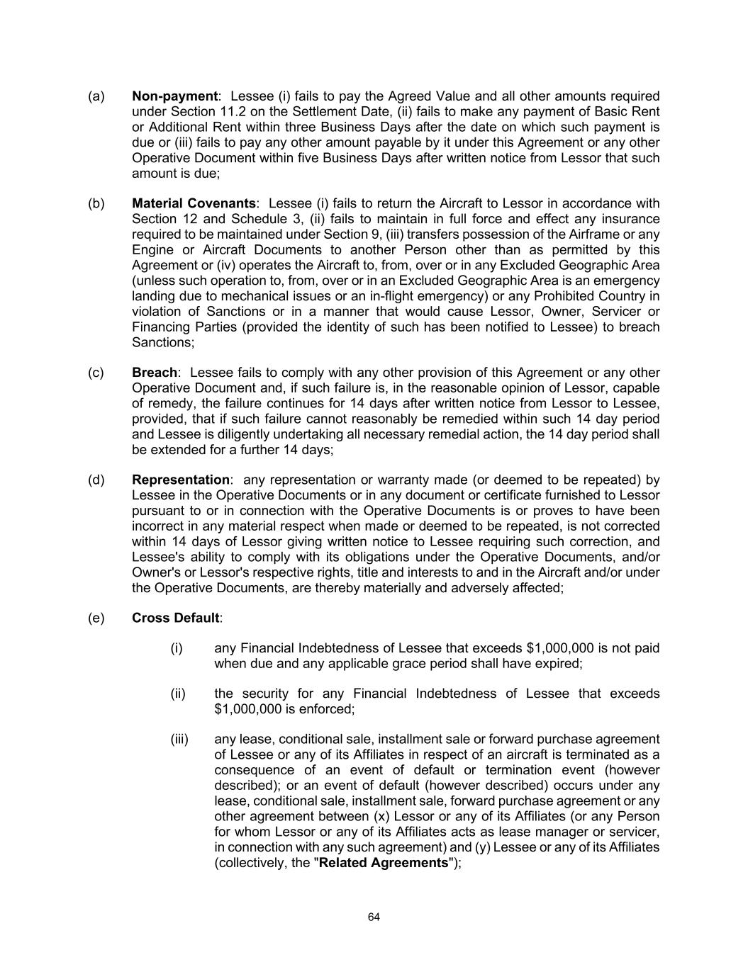64 (a) Non-payment: Lessee (i) fails to pay the Agreed Value and all other amounts required under Section 11.2 on the Settlement Date, (ii) fails to make any payment of Basic Rent or Additional Rent within three Business Days after the date on which such payment is due or (iii) fails to pay any other amount payable by it under this Agreement or any other Operative Document within five Business Days after written notice from Lessor that such amount is due; (b) Material Covenants: Lessee (i) fails to return the Aircraft to Lessor in accordance with Section 12 and Schedule 3, (ii) fails to maintain in full force and effect any insurance required to be maintained under Section 9, (iii) transfers possession of the Airframe or any Engine or Aircraft Documents to another Person other than as permitted by this Agreement or (iv) operates the Aircraft to, from, over or in any Excluded Geographic Area (unless such operation to, from, over or in an Excluded Geographic Area is an emergency landing due to mechanical issues or an in-flight emergency) or any Prohibited Country in violation of Sanctions or in a manner that would cause Lessor, Owner, Servicer or Financing Parties (provided the identity of such has been notified to Lessee) to breach Sanctions; (c) Breach: Lessee fails to comply with any other provision of this Agreement or any other Operative Document and, if such failure is, in the reasonable opinion of Lessor, capable of remedy, the failure continues for 14 days after written notice from Lessor to Lessee, provided, that if such failure cannot reasonably be remedied within such 14 day period and Lessee is diligently undertaking all necessary remedial action, the 14 day period shall be extended for a further 14 days; (d) Representation: any representation or warranty made (or deemed to be repeated) by Lessee in the Operative Documents or in any document or certificate furnished to Lessor pursuant to or in connection with the Operative Documents is or proves to have been incorrect in any material respect when made or deemed to be repeated, is not corrected within 14 days of Lessor giving written notice to Lessee requiring such correction, and Lessee's ability to comply with its obligations under the Operative Documents, and/or Owner's or Lessor's respective rights, title and interests to and in the Aircraft and/or under the Operative Documents, are thereby materially and adversely affected; (e) Cross Default: (i) any Financial Indebtedness of Lessee that exceeds $1,000,000 is not paid when due and any applicable grace period shall have expired; (ii) the security for any Financial Indebtedness of Lessee that exceeds $1,000,000 is enforced; (iii) any lease, conditional sale, installment sale or forward purchase agreement of Lessee or any of its Affiliates in respect of an aircraft is terminated as a consequence of an event of default or termination event (however described); or an event of default (however described) occurs under any lease, conditional sale, installment sale, forward purchase agreement or any other agreement between (x) Lessor or any of its Affiliates (or any Person for whom Lessor or any of its Affiliates acts as lease manager or servicer, in connection with any such agreement) and (y) Lessee or any of its Affiliates (collectively, the "Related Agreements");