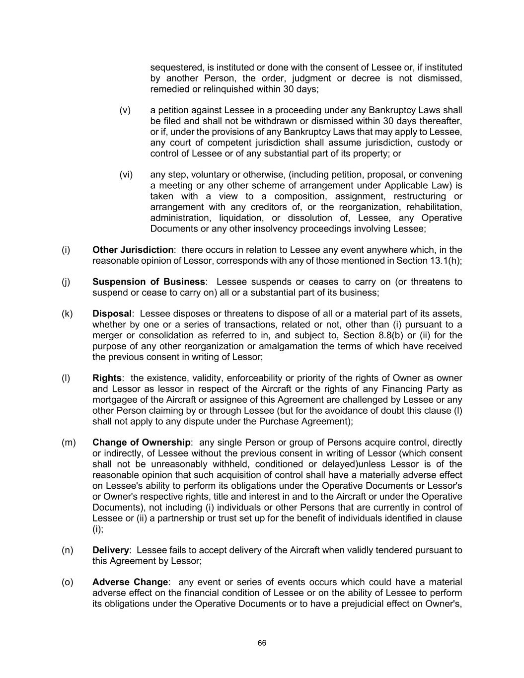 66 sequestered, is instituted or done with the consent of Lessee or, if instituted by another Person, the order, judgment or decree is not dismissed, remedied or relinquished within 30 days; (v) a petition against Lessee in a proceeding under any Bankruptcy Laws shall be filed and shall not be withdrawn or dismissed within 30 days thereafter, or if, under the provisions of any Bankruptcy Laws that may apply to Lessee, any court of competent jurisdiction shall assume jurisdiction, custody or control of Lessee or of any substantial part of its property; or (vi) any step, voluntary or otherwise, (including petition, proposal, or convening a meeting or any other scheme of arrangement under Applicable Law) is taken with a view to a composition, assignment, restructuring or arrangement with any creditors of, or the reorganization, rehabilitation, administration, liquidation, or dissolution of, Lessee, any Operative Documents or any other insolvency proceedings involving Lessee; (i) Other Jurisdiction: there occurs in relation to Lessee any event anywhere which, in the reasonable opinion of Lessor, corresponds with any of those mentioned in Section 13.1(h); (j) Suspension of Business: Lessee suspends or ceases to carry on (or threatens to suspend or cease to carry on) all or a substantial part of its business; (k) Disposal: Lessee disposes or threatens to dispose of all or a material part of its assets, whether by one or a series of transactions, related or not, other than (i) pursuant to a merger or consolidation as referred to in, and subject to, Section 8.8(b) or (ii) for the purpose of any other reorganization or amalgamation the terms of which have received the previous consent in writing of Lessor; (l) Rights: the existence, validity, enforceability or priority of the rights of Owner as owner and Lessor as lessor in respect of the Aircraft or the rights of any Financing Party as mortgagee of the Aircraft or assignee of this Agreement are challenged by Lessee or any other Person claiming by or through Lessee (but for the avoidance of doubt this clause (l) shall not apply to any dispute under the Purchase Agreement); (m) Change of Ownership: any single Person or group of Persons acquire control, directly or indirectly, of Lessee without the previous consent in writing of Lessor (which consent shall not be unreasonably withheld, conditioned or delayed)unless Lessor is of the reasonable opinion that such acquisition of control shall have a materially adverse effect on Lessee's ability to perform its obligations under the Operative Documents or Lessor's or Owner's respective rights, title and interest in and to the Aircraft or under the Operative Documents), not including (i) individuals or other Persons that are currently in control of Lessee or (ii) a partnership or trust set up for the benefit of individuals identified in clause (i); (n) Delivery: Lessee fails to accept delivery of the Aircraft when validly tendered pursuant to this Agreement by Lessor; (o) Adverse Change: any event or series of events occurs which could have a material adverse effect on the financial condition of Lessee or on the ability of Lessee to perform its obligations under the Operative Documents or to have a prejudicial effect on Owner's,