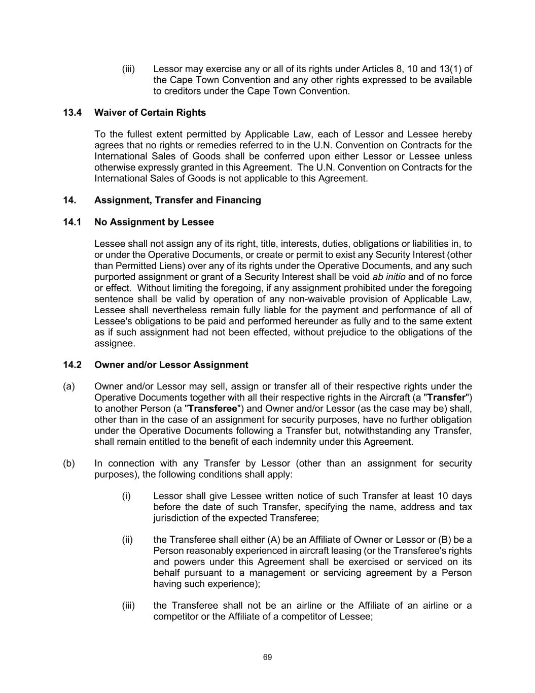 69 (iii) Lessor may exercise any or all of its rights under Articles 8, 10 and 13(1) of the Cape Town Convention and any other rights expressed to be available to creditors under the Cape Town Convention. 13.4 Waiver of Certain Rights To the fullest extent permitted by Applicable Law, each of Lessor and Lessee hereby agrees that no rights or remedies referred to in the U.N. Convention on Contracts for the International Sales of Goods shall be conferred upon either Lessor or Lessee unless otherwise expressly granted in this Agreement. The U.N. Convention on Contracts for the International Sales of Goods is not applicable to this Agreement. 14. Assignment, Transfer and Financing 14.1 No Assignment by Lessee Lessee shall not assign any of its right, title, interests, duties, obligations or liabilities in, to or under the Operative Documents, or create or permit to exist any Security Interest (other than Permitted Liens) over any of its rights under the Operative Documents, and any such purported assignment or grant of a Security Interest shall be void ab initio and of no force or effect. Without limiting the foregoing, if any assignment prohibited under the foregoing sentence shall be valid by operation of any non-waivable provision of Applicable Law, Lessee shall nevertheless remain fully liable for the payment and performance of all of Lessee's obligations to be paid and performed hereunder as fully and to the same extent as if such assignment had not been effected, without prejudice to the obligations of the assignee. 14.2 Owner and/or Lessor Assignment (a) Owner and/or Lessor may sell, assign or transfer all of their respective rights under the Operative Documents together with all their respective rights in the Aircraft (a "Transfer") to another Person (a "Transferee") and Owner and/or Lessor (as the case may be) shall, other than in the case of an assignment for security purposes, have no further obligation under the Operative Documents following a Transfer but, notwithstanding any Transfer, shall remain entitled to the benefit of each indemnity under this Agreement. (b) In connection with any Transfer by Lessor (other than an assignment for security purposes), the following conditions shall apply: (i) Lessor shall give Lessee written notice of such Transfer at least 10 days before the date of such Transfer, specifying the name, address and tax jurisdiction of the expected Transferee; (ii) the Transferee shall either (A) be an Affiliate of Owner or Lessor or (B) be a Person reasonably experienced in aircraft leasing (or the Transferee's rights and powers under this Agreement shall be exercised or serviced on its behalf pursuant to a management or servicing agreement by a Person having such experience); (iii) the Transferee shall not be an airline or the Affiliate of an airline or a competitor or the Affiliate of a competitor of Lessee;