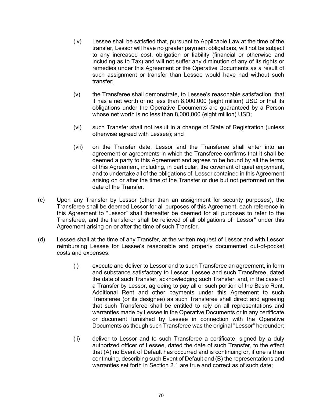 70 (iv) Lessee shall be satisfied that, pursuant to Applicable Law at the time of the transfer, Lessor will have no greater payment obligations, will not be subject to any increased cost, obligation or liability (financial or otherwise and including as to Tax) and will not suffer any diminution of any of its rights or remedies under this Agreement or the Operative Documents as a result of such assignment or transfer than Lessee would have had without such transfer; (v) the Transferee shall demonstrate, to Lessee’s reasonable satisfaction, that it has a net worth of no less than 8,000,000 (eight million) USD or that its obligations under the Operative Documents are guaranteed by a Person whose net worth is no less than 8,000,000 (eight million) USD; (vi) such Transfer shall not result in a change of State of Registration (unless otherwise agreed with Lessee); and (vii) on the Transfer date, Lessor and the Transferee shall enter into an agreement or agreements in which the Transferee confirms that it shall be deemed a party to this Agreement and agrees to be bound by all the terms of this Agreement, including, in particular, the covenant of quiet enjoyment, and to undertake all of the obligations of, Lessor contained in this Agreement arising on or after the time of the Transfer or due but not performed on the date of the Transfer. (c) Upon any Transfer by Lessor (other than an assignment for security purposes), the Transferee shall be deemed Lessor for all purposes of this Agreement, each reference in this Agreement to "Lessor" shall thereafter be deemed for all purposes to refer to the Transferee, and the transferor shall be relieved of all obligations of "Lessor" under this Agreement arising on or after the time of such Transfer. (d) Lessee shall at the time of any Transfer, at the written request of Lessor and with Lessor reimbursing Lessee for Lessee's reasonable and properly documented out-of-pocket costs and expenses: (i) execute and deliver to Lessor and to such Transferee an agreement, in form and substance satisfactory to Lessor, Lessee and such Transferee, dated the date of such Transfer, acknowledging such Transfer, and, in the case of a Transfer by Lessor, agreeing to pay all or such portion of the Basic Rent, Additional Rent and other payments under this Agreement to such Transferee (or its designee) as such Transferee shall direct and agreeing that such Transferee shall be entitled to rely on all representations and warranties made by Lessee in the Operative Documents or in any certificate or document furnished by Lessee in connection with the Operative Documents as though such Transferee was the original "Lessor" hereunder; (ii) deliver to Lessor and to such Transferee a certificate, signed by a duly authorized officer of Lessee, dated the date of such Transfer, to the effect that (A) no Event of Default has occurred and is continuing or, if one is then continuing, describing such Event of Default and (B) the representations and warranties set forth in Section 2.1 are true and correct as of such date;