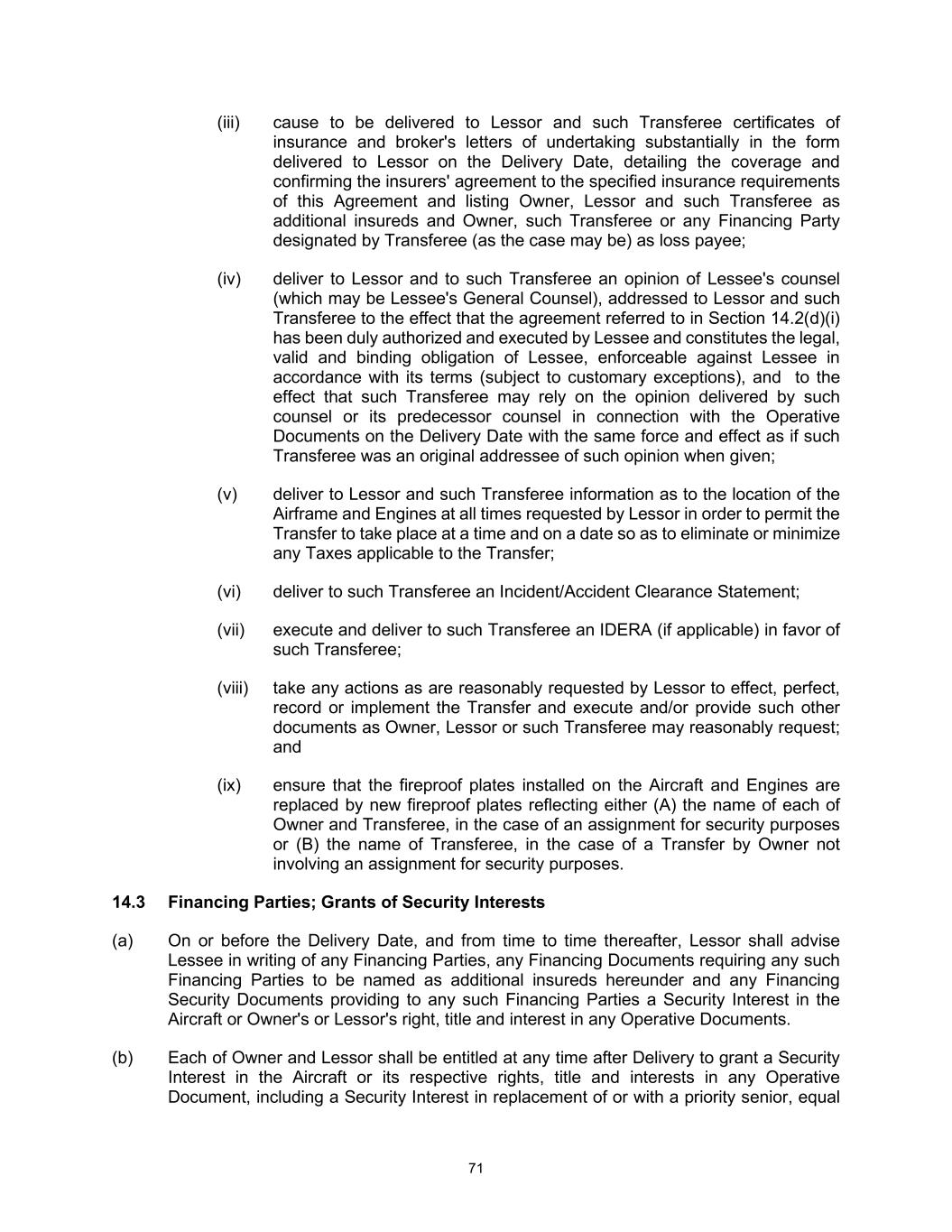 71 (iii) cause to be delivered to Lessor and such Transferee certificates of insurance and broker's letters of undertaking substantially in the form delivered to Lessor on the Delivery Date, detailing the coverage and confirming the insurers' agreement to the specified insurance requirements of this Agreement and listing Owner, Lessor and such Transferee as additional insureds and Owner, such Transferee or any Financing Party designated by Transferee (as the case may be) as loss payee; (iv) deliver to Lessor and to such Transferee an opinion of Lessee's counsel (which may be Lessee's General Counsel), addressed to Lessor and such Transferee to the effect that the agreement referred to in Section 14.2(d)(i) has been duly authorized and executed by Lessee and constitutes the legal, valid and binding obligation of Lessee, enforceable against Lessee in accordance with its terms (subject to customary exceptions), and to the effect that such Transferee may rely on the opinion delivered by such counsel or its predecessor counsel in connection with the Operative Documents on the Delivery Date with the same force and effect as if such Transferee was an original addressee of such opinion when given; (v) deliver to Lessor and such Transferee information as to the location of the Airframe and Engines at all times requested by Lessor in order to permit the Transfer to take place at a time and on a date so as to eliminate or minimize any Taxes applicable to the Transfer; (vi) deliver to such Transferee an Incident/Accident Clearance Statement; (vii) execute and deliver to such Transferee an IDERA (if applicable) in favor of such Transferee; (viii) take any actions as are reasonably requested by Lessor to effect, perfect, record or implement the Transfer and execute and/or provide such other documents as Owner, Lessor or such Transferee may reasonably request; and (ix) ensure that the fireproof plates installed on the Aircraft and Engines are replaced by new fireproof plates reflecting either (A) the name of each of Owner and Transferee, in the case of an assignment for security purposes or (B) the name of Transferee, in the case of a Transfer by Owner not involving an assignment for security purposes. 14.3 Financing Parties; Grants of Security Interests (a) On or before the Delivery Date, and from time to time thereafter, Lessor shall advise Lessee in writing of any Financing Parties, any Financing Documents requiring any such Financing Parties to be named as additional insureds hereunder and any Financing Security Documents providing to any such Financing Parties a Security Interest in the Aircraft or Owner's or Lessor's right, title and interest in any Operative Documents. (b) Each of Owner and Lessor shall be entitled at any time after Delivery to grant a Security Interest in the Aircraft or its respective rights, title and interests in any Operative Document, including a Security Interest in replacement of or with a priority senior, equal