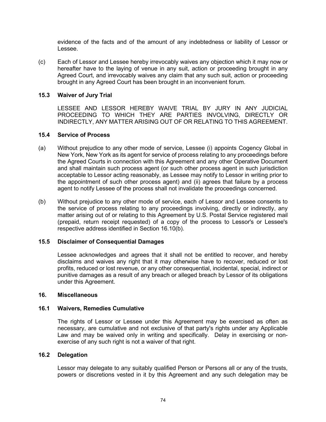 74 evidence of the facts and of the amount of any indebtedness or liability of Lessor or Lessee. (c) Each of Lessor and Lessee hereby irrevocably waives any objection which it may now or hereafter have to the laying of venue in any suit, action or proceeding brought in any Agreed Court, and irrevocably waives any claim that any such suit, action or proceeding brought in any Agreed Court has been brought in an inconvenient forum. 15.3 Waiver of Jury Trial LESSEE AND LESSOR HEREBY WAIVE TRIAL BY JURY IN ANY JUDICIAL PROCEEDING TO WHICH THEY ARE PARTIES INVOLVING, DIRECTLY OR INDIRECTLY, ANY MATTER ARISING OUT OF OR RELATING TO THIS AGREEMENT. 15.4 Service of Process (a) Without prejudice to any other mode of service, Lessee (i) appoints Cogency Global in New York, New York as its agent for service of process relating to any proceedings before the Agreed Courts in connection with this Agreement and any other Operative Document and shall maintain such process agent (or such other process agent in such jurisdiction acceptable to Lessor acting reasonably, as Lessee may notify to Lessor in writing prior to the appointment of such other process agent) and (ii) agrees that failure by a process agent to notify Lessee of the process shall not invalidate the proceedings concerned. (b) Without prejudice to any other mode of service, each of Lessor and Lessee consents to the service of process relating to any proceedings involving, directly or indirectly, any matter arising out of or relating to this Agreement by U.S. Postal Service registered mail (prepaid, return receipt requested) of a copy of the process to Lessor's or Lessee's respective address identified in Section 16.10(b). 15.5 Disclaimer of Consequential Damages Lessee acknowledges and agrees that it shall not be entitled to recover, and hereby disclaims and waives any right that it may otherwise have to recover, reduced or lost profits, reduced or lost revenue, or any other consequential, incidental, special, indirect or punitive damages as a result of any breach or alleged breach by Lessor of its obligations under this Agreement. 16. Miscellaneous 16.1 Waivers, Remedies Cumulative The rights of Lessor or Lessee under this Agreement may be exercised as often as necessary, are cumulative and not exclusive of that party's rights under any Applicable Law and may be waived only in writing and specifically. Delay in exercising or non- exercise of any such right is not a waiver of that right. 16.2 Delegation Lessor may delegate to any suitably qualified Person or Persons all or any of the trusts, powers or discretions vested in it by this Agreement and any such delegation may be