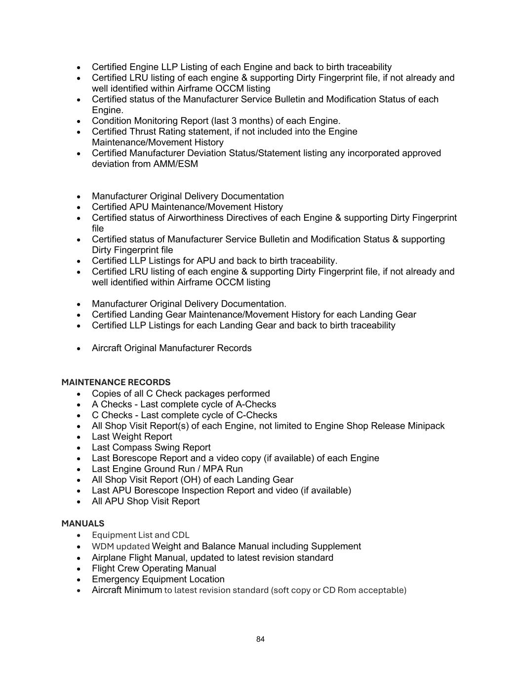 84 • Certified Engine LLP Listing of each Engine and back to birth traceability • Certified LRU listing of each engine & supporting Dirty Fingerprint file, if not already and well identified within Airframe OCCM listing • Certified status of the Manufacturer Service Bulletin and Modification Status of each Engine. • Condition Monitoring Report (last 3 months) of each Engine. • Certified Thrust Rating statement, if not included into the Engine Maintenance/Movement History • Certified Manufacturer Deviation Status/Statement listing any incorporated approved deviation from AMM/ESM • Manufacturer Original Delivery Documentation • Certified APU Maintenance/Movement History • Certified status of Airworthiness Directives of each Engine & supporting Dirty Fingerprint file • Certified status of Manufacturer Service Bulletin and Modification Status & supporting Dirty Fingerprint file • Certified LLP Listings for APU and back to birth traceability. • Certified LRU listing of each engine & supporting Dirty Fingerprint file, if not already and well identified within Airframe OCCM listing • Manufacturer Original Delivery Documentation. • Certified Landing Gear Maintenance/Movement History for each Landing Gear • Certified LLP Listings for each Landing Gear and back to birth traceability • Aircraft Original Manufacturer Records MAINTENANCE RECORDS • Copies of all C Check packages performed • A Checks - Last complete cycle of A-Checks • C Checks - Last complete cycle of C-Checks • All Shop Visit Report(s) of each Engine, not limited to Engine Shop Release Minipack • Last Weight Report • Last Compass Swing Report • Last Borescope Report and a video copy (if available) of each Engine • Last Engine Ground Run / MPA Run • All Shop Visit Report (OH) of each Landing Gear • Last APU Borescope Inspection Report and video (if available) • All APU Shop Visit Report MANUALS • Equipment List and CDL • WDM updated Weight and Balance Manual including Supplement • Airplane Flight Manual, updated to latest revision standard • Flight Crew Operating Manual • Emergency Equipment Location • Aircraft Minimum to latest revision standard (soft copy or CD Rom acceptable)