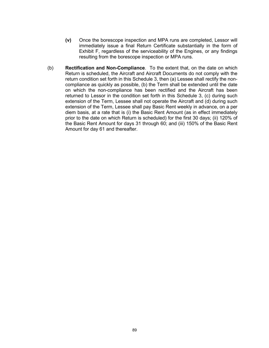 89 (v) Once the borescope inspection and MPA runs are completed, Lessor will immediately issue a final Return Certificate substantially in the form of Exhibit F, regardless of the serviceability of the Engines, or any findings resulting from the borescope inspection or MPA runs. (b) Rectification and Non-Compliance. To the extent that, on the date on which Return is scheduled, the Aircraft and Aircraft Documents do not comply with the return condition set forth in this Schedule 3, then (a) Lessee shall rectify the non- compliance as quickly as possible, (b) the Term shall be extended until the date on which the non-compliance has been rectified and the Aircraft has been returned to Lessor in the condition set forth in this Schedule 3, (c) during such extension of the Term, Lessee shall not operate the Aircraft and (d) during such extension of the Term, Lessee shall pay Basic Rent weekly in advance, on a per diem basis, at a rate that is (i) the Basic Rent Amount (as in effect immediately prior to the date on which Return is scheduled) for the first 30 days; (ii) 120% of the Basic Rent Amount for days 31 through 60; and (iii) 150% of the Basic Rent Amount for day 61 and thereafter.