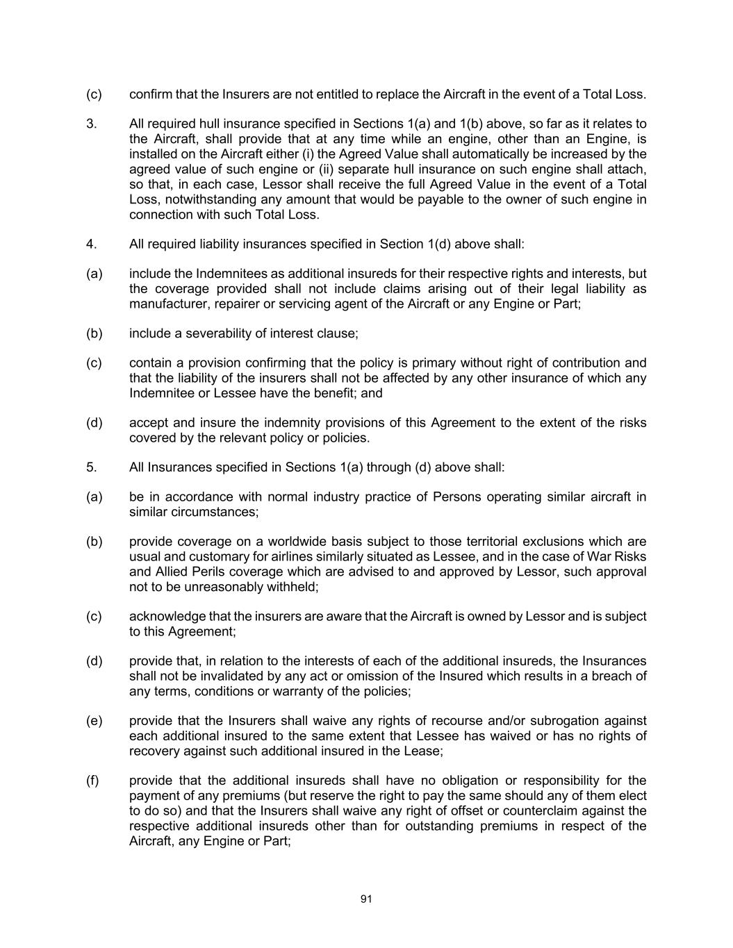 91 (c) confirm that the Insurers are not entitled to replace the Aircraft in the event of a Total Loss. 3. All required hull insurance specified in Sections 1(a) and 1(b) above, so far as it relates to the Aircraft, shall provide that at any time while an engine, other than an Engine, is installed on the Aircraft either (i) the Agreed Value shall automatically be increased by the agreed value of such engine or (ii) separate hull insurance on such engine shall attach, so that, in each case, Lessor shall receive the full Agreed Value in the event of a Total Loss, notwithstanding any amount that would be payable to the owner of such engine in connection with such Total Loss. 4. All required liability insurances specified in Section 1(d) above shall: (a) include the Indemnitees as additional insureds for their respective rights and interests, but the coverage provided shall not include claims arising out of their legal liability as manufacturer, repairer or servicing agent of the Aircraft or any Engine or Part; (b) include a severability of interest clause; (c) contain a provision confirming that the policy is primary without right of contribution and that the liability of the insurers shall not be affected by any other insurance of which any Indemnitee or Lessee have the benefit; and (d) accept and insure the indemnity provisions of this Agreement to the extent of the risks covered by the relevant policy or policies. 5. All Insurances specified in Sections 1(a) through (d) above shall: (a) be in accordance with normal industry practice of Persons operating similar aircraft in similar circumstances; (b) provide coverage on a worldwide basis subject to those territorial exclusions which are usual and customary for airlines similarly situated as Lessee, and in the case of War Risks and Allied Perils coverage which are advised to and approved by Lessor, such approval not to be unreasonably withheld; (c) acknowledge that the insurers are aware that the Aircraft is owned by Lessor and is subject to this Agreement; (d) provide that, in relation to the interests of each of the additional insureds, the Insurances shall not be invalidated by any act or omission of the Insured which results in a breach of any terms, conditions or warranty of the policies; (e) provide that the Insurers shall waive any rights of recourse and/or subrogation against each additional insured to the same extent that Lessee has waived or has no rights of recovery against such additional insured in the Lease; (f) provide that the additional insureds shall have no obligation or responsibility for the payment of any premiums (but reserve the right to pay the same should any of them elect to do so) and that the Insurers shall waive any right of offset or counterclaim against the respective additional insureds other than for outstanding premiums in respect of the Aircraft, any Engine or Part;
