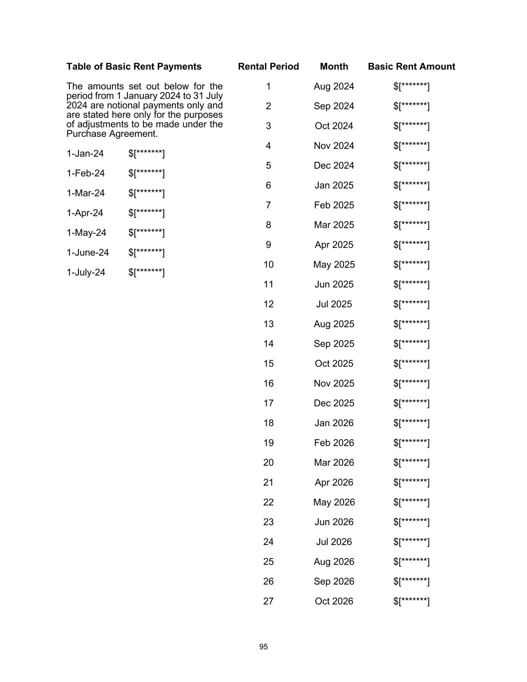 95 Table of Basic Rent Payments The amounts set out below for the period from 1 January 2024 to 31 July 2024 are notional payments only and are stated here only for the purposes of adjustments to be made under the Purchase Agreement. 1-Jan-24 $[*******] 1-Feb-24 $[*******] 1-Mar-24 $[*******] 1-Apr-24 $[*******] 1-May-24 $[*******] 1-June-24 $[*******] 1-July-24 $[*******] Rental Period Month Basic Rent Amount 1 Aug 2024 $[*******] 2 Sep 2024 $[*******] 3 Oct 2024 $[*******] 4 Nov 2024 $[*******] 5 Dec 2024 $[*******] 6 Jan 2025 $[*******] 7 Feb 2025 $[*******] 8 Mar 2025 $[*******] 9 Apr 2025 $[*******] 10 May 2025 $[*******] 11 Jun 2025 $[*******] 12 Jul 2025 $[*******] 13 Aug 2025 $[*******] 14 Sep 2025 $[*******] 15 Oct 2025 $[*******] 16 Nov 2025 $[*******] 17 Dec 2025 $[*******] 18 Jan 2026 $[*******] 19 Feb 2026 $[*******] 20 Mar 2026 $[*******] 21 Apr 2026 $[*******] 22 May 2026 $[*******] 23 Jun 2026 $[*******] 24 Jul 2026 $[*******] 25 Aug 2026 $[*******] 26 Sep 2026 $[*******] 27 Oct 2026 $[*******]