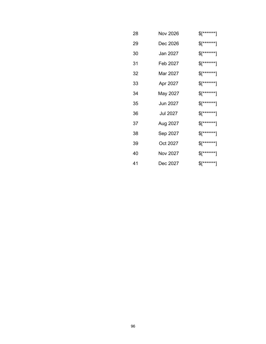 96 28 Nov 2026 $[*******] 29 Dec 2026 $[*******] 30 Jan 2027 $[*******] 31 Feb 2027 $[*******] 32 Mar 2027 $[*******] 33 Apr 2027 $[*******] 34 May 2027 $[*******] 35 Jun 2027 $[*******] 36 Jul 2027 $[*******] 37 Aug 2027 $[*******] 38 Sep 2027 $[*******] 39 Oct 2027 $[*******] 40 Nov 2027 $[*******] 41 Dec 2027 $[*******]