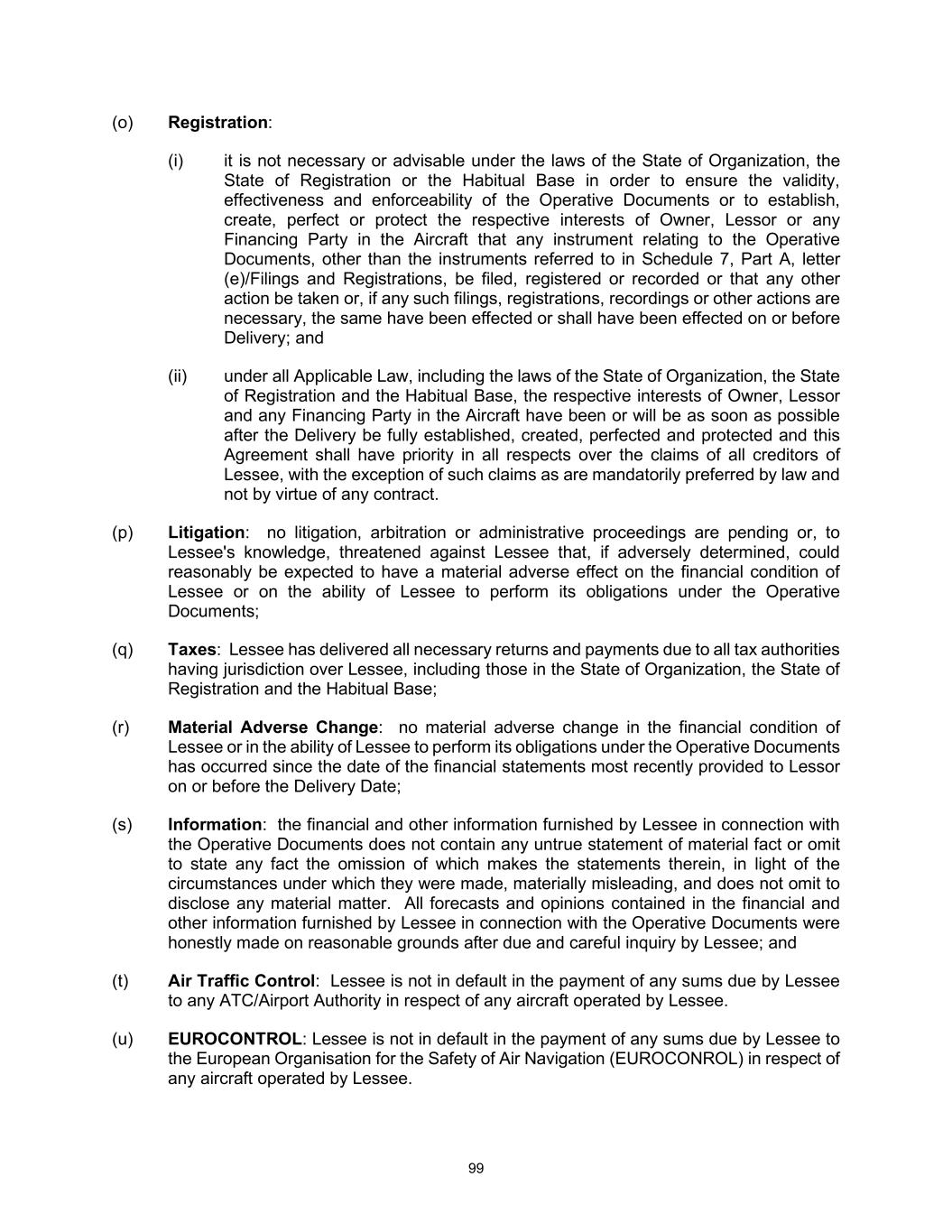 99 (o) Registration: (i) it is not necessary or advisable under the laws of the State of Organization, the State of Registration or the Habitual Base in order to ensure the validity, effectiveness and enforceability of the Operative Documents or to establish, create, perfect or protect the respective interests of Owner, Lessor or any Financing Party in the Aircraft that any instrument relating to the Operative Documents, other than the instruments referred to in Schedule 7, Part A, letter (e)/Filings and Registrations, be filed, registered or recorded or that any other action be taken or, if any such filings, registrations, recordings or other actions are necessary, the same have been effected or shall have been effected on or before Delivery; and (ii) under all Applicable Law, including the laws of the State of Organization, the State of Registration and the Habitual Base, the respective interests of Owner, Lessor and any Financing Party in the Aircraft have been or will be as soon as possible after the Delivery be fully established, created, perfected and protected and this Agreement shall have priority in all respects over the claims of all creditors of Lessee, with the exception of such claims as are mandatorily preferred by law and not by virtue of any contract. (p) Litigation: no litigation, arbitration or administrative proceedings are pending or, to Lessee's knowledge, threatened against Lessee that, if adversely determined, could reasonably be expected to have a material adverse effect on the financial condition of Lessee or on the ability of Lessee to perform its obligations under the Operative Documents; (q) Taxes: Lessee has delivered all necessary returns and payments due to all tax authorities having jurisdiction over Lessee, including those in the State of Organization, the State of Registration and the Habitual Base; (r) Material Adverse Change: no material adverse change in the financial condition of Lessee or in the ability of Lessee to perform its obligations under the Operative Documents has occurred since the date of the financial statements most recently provided to Lessor on or before the Delivery Date; (s) Information: the financial and other information furnished by Lessee in connection with the Operative Documents does not contain any untrue statement of material fact or omit to state any fact the omission of which makes the statements therein, in light of the circumstances under which they were made, materially misleading, and does not omit to disclose any material matter. All forecasts and opinions contained in the financial and other information furnished by Lessee in connection with the Operative Documents were honestly made on reasonable grounds after due and careful inquiry by Lessee; and (t) Air Traffic Control: Lessee is not in default in the payment of any sums due by Lessee to any ATC/Airport Authority in respect of any aircraft operated by Lessee. (u) EUROCONTROL: Lessee is not in default in the payment of any sums due by Lessee to the European Organisation for the Safety of Air Navigation (EUROCONROL) in respect of any aircraft operated by Lessee.