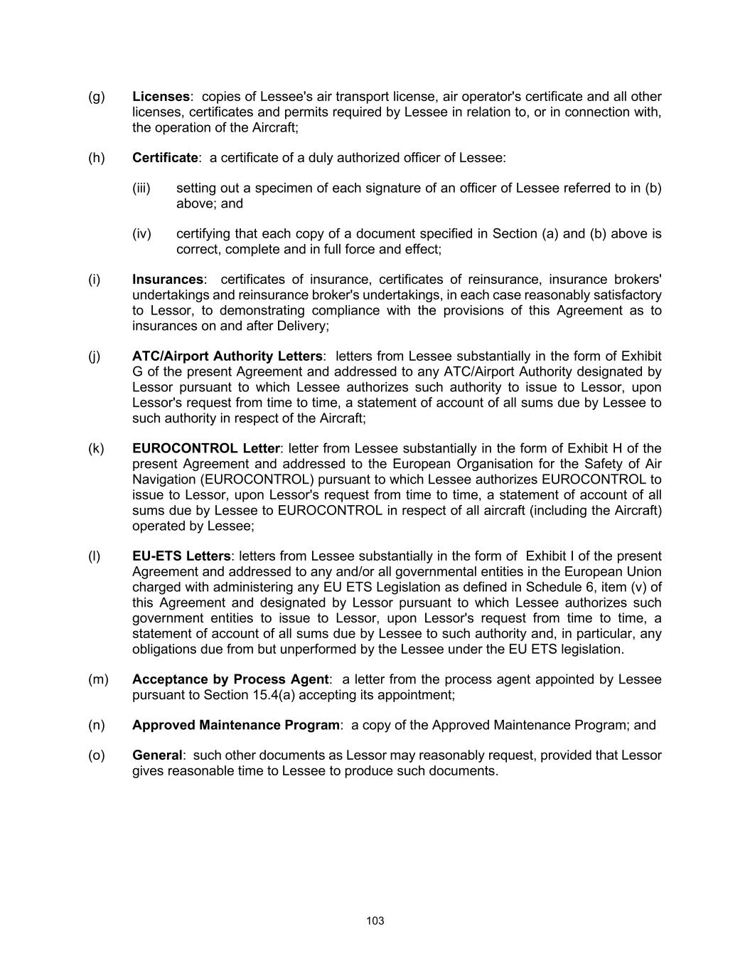 103 (g) Licenses: copies of Lessee's air transport license, air operator's certificate and all other licenses, certificates and permits required by Lessee in relation to, or in connection with, the operation of the Aircraft; (h) Certificate: a certificate of a duly authorized officer of Lessee: (iii) setting out a specimen of each signature of an officer of Lessee referred to in (b) above; and (iv) certifying that each copy of a document specified in Section (a) and (b) above is correct, complete and in full force and effect; (i) Insurances: certificates of insurance, certificates of reinsurance, insurance brokers' undertakings and reinsurance broker's undertakings, in each case reasonably satisfactory to Lessor, to demonstrating compliance with the provisions of this Agreement as to insurances on and after Delivery; (j) ATC/Airport Authority Letters: letters from Lessee substantially in the form of Exhibit G of the present Agreement and addressed to any ATC/Airport Authority designated by Lessor pursuant to which Lessee authorizes such authority to issue to Lessor, upon Lessor's request from time to time, a statement of account of all sums due by Lessee to such authority in respect of the Aircraft; (k) EUROCONTROL Letter: letter from Lessee substantially in the form of Exhibit H of the present Agreement and addressed to the European Organisation for the Safety of Air Navigation (EUROCONTROL) pursuant to which Lessee authorizes EUROCONTROL to issue to Lessor, upon Lessor's request from time to time, a statement of account of all sums due by Lessee to EUROCONTROL in respect of all aircraft (including the Aircraft) operated by Lessee; (l) EU-ETS Letters: letters from Lessee substantially in the form of Exhibit I of the present Agreement and addressed to any and/or all governmental entities in the European Union charged with administering any EU ETS Legislation as defined in Schedule 6, item (v) of this Agreement and designated by Lessor pursuant to which Lessee authorizes such government entities to issue to Lessor, upon Lessor's request from time to time, a statement of account of all sums due by Lessee to such authority and, in particular, any obligations due from but unperformed by the Lessee under the EU ETS legislation. (m) Acceptance by Process Agent: a letter from the process agent appointed by Lessee pursuant to Section 15.4(a) accepting its appointment; (n) Approved Maintenance Program: a copy of the Approved Maintenance Program; and (o) General: such other documents as Lessor may reasonably request, provided that Lessor gives reasonable time to Lessee to produce such documents.