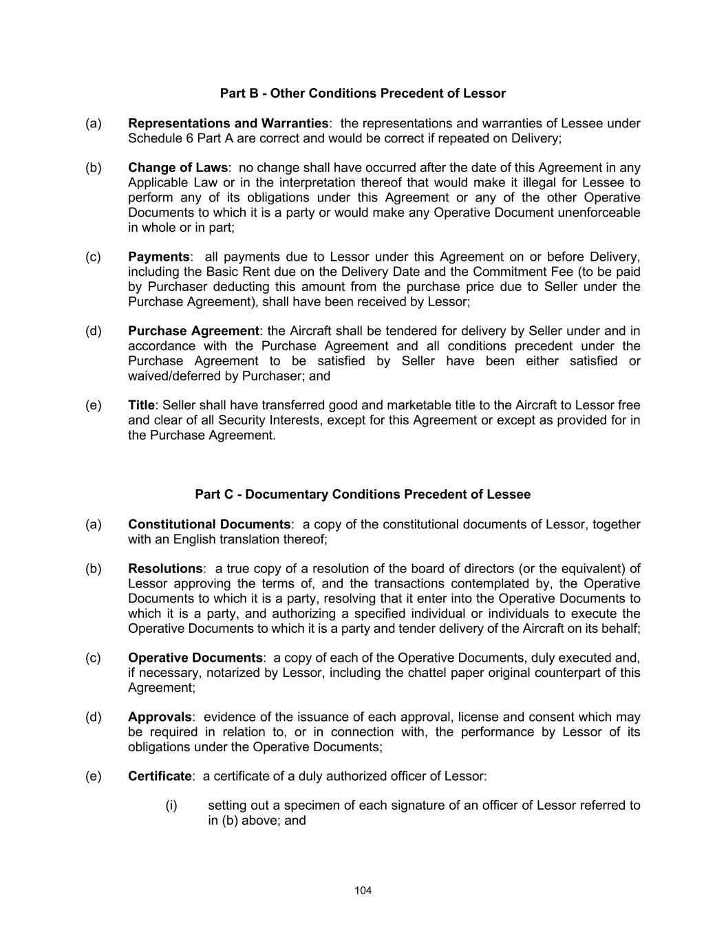 104 Part B - Other Conditions Precedent of Lessor (a) Representations and Warranties: the representations and warranties of Lessee under Schedule 6 Part A are correct and would be correct if repeated on Delivery; (b) Change of Laws: no change shall have occurred after the date of this Agreement in any Applicable Law or in the interpretation thereof that would make it illegal for Lessee to perform any of its obligations under this Agreement or any of the other Operative Documents to which it is a party or would make any Operative Document unenforceable in whole or in part; (c) Payments: all payments due to Lessor under this Agreement on or before Delivery, including the Basic Rent due on the Delivery Date and the Commitment Fee (to be paid by Purchaser deducting this amount from the purchase price due to Seller under the Purchase Agreement), shall have been received by Lessor; (d) Purchase Agreement: the Aircraft shall be tendered for delivery by Seller under and in accordance with the Purchase Agreement and all conditions precedent under the Purchase Agreement to be satisfied by Seller have been either satisfied or waived/deferred by Purchaser; and (e) Title: Seller shall have transferred good and marketable title to the Aircraft to Lessor free and clear of all Security Interests, except for this Agreement or except as provided for in the Purchase Agreement. Part C - Documentary Conditions Precedent of Lessee (a) Constitutional Documents: a copy of the constitutional documents of Lessor, together with an English translation thereof; (b) Resolutions: a true copy of a resolution of the board of directors (or the equivalent) of Lessor approving the terms of, and the transactions contemplated by, the Operative Documents to which it is a party, resolving that it enter into the Operative Documents to which it is a party, and authorizing a specified individual or individuals to execute the Operative Documents to which it is a party and tender delivery of the Aircraft on its behalf; (c) Operative Documents: a copy of each of the Operative Documents, duly executed and, if necessary, notarized by Lessor, including the chattel paper original counterpart of this Agreement; (d) Approvals: evidence of the issuance of each approval, license and consent which may be required in relation to, or in connection with, the performance by Lessor of its obligations under the Operative Documents; (e) Certificate: a certificate of a duly authorized officer of Lessor: (i) setting out a specimen of each signature of an officer of Lessor referred to in (b) above; and