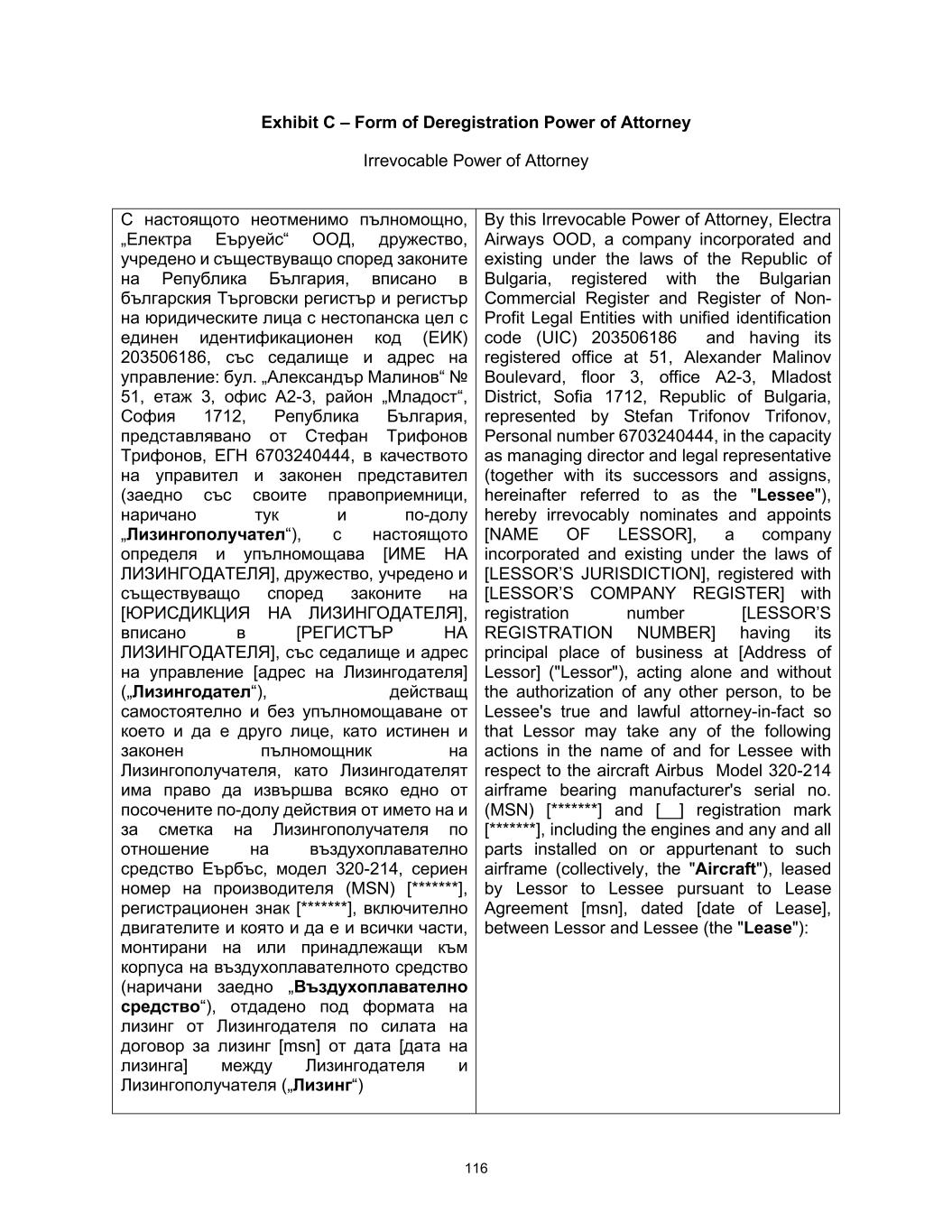 116 Exhibit C – Form of Deregistration Power of Attorney Irrevocable Power of Attorney С настоящото неотменимо пълномощно, „Електра Еъруейс“ ООД, дружество, учредено и съществуващо според законите на Република България, вписано в българския Търговски регистър и регистър на юридическите лица с нестопанска цел с единен идентификационен код (ЕИК) 203506186, със седалище и адрес на управление: бул. „Александър Малинов“ № 51, етаж 3, офис А2-3, район „Младост“, София 1712, Република България, представлявано от Стефан Трифонов Трифонов, ЕГН 6703240444, в качеството на управител и законен представител (заедно със своите правоприемници, наричано тук и по-долу „Лизингополучател“), с настоящото определя и упълномощава [ИМЕ НА ЛИЗИНГОДАТЕЛЯ], дружество, учредено и съществуващо според законите на [ЮРИСДИКЦИЯ НА ЛИЗИНГОДАТЕЛЯ], вписано в [РЕГИСТЪР НА ЛИЗИНГОДАТЕЛЯ], със седалище и адрес на управление [адрес на Лизингодателя] („Лизингодател“), действащ самостоятелно и без упълномощаване от което и да е друго лице, като истинен и законен пълномощник на Лизингополучателя, като Лизингодателят има право да извършва всяко едно от посочените по-долу действия от името на и за сметка на Лизингополучателя по отношение на въздухоплавателно средство Еърбъс, модел 321-111, сериен номер на производителя (MSN) [*******], регистрационен знак [*******], включително двигателите и която и да е и всички части, монтирани на или принадлежащи към корпуса на въздухоплавателното средство (наричани заедно „Въздухоплавателно средство“), отдадено под формата на лизинг от Лизингодателя по силата на договор за лизинг [msn] от дата [дата на лизинга] между Лизингодателя и Лизингополучателя („Лизинг“) By this Irrevocable Power of Attorney, Electra Airways OOD, a company incorporated and existing under the laws of the Republic of Bulgaria, registered with the Bulgarian Commercial Register and Register of Non- Profit Legal Entities with unified identification code (UIC) 203506186 and having its registered office at 51, Alexander Malinov Boulevard, floor 3, office A2-3, Mladost District, Sofia 1712, Republic of Bulgaria, represented by Stefan Trifonov Trifonov, Personal number 6703240444, in the capacity as managing director and legal representative (together with its successors and assigns, hereinafter referred to as the "Lessee"), hereby irrevocably nominates and appoints [NAME OF LESSOR], a company incorporated and existing under the laws of [LESSOR’S JURISDICTION], registered with [LESSOR’S COMPANY REGISTER] with registration number [LESSOR’S REGISTRATION NUMBER] having its principal place of business at [Address of Lessor] ("Lessor"), acting alone and without the authorization of any other person, to be Lessee's true and lawful attorney-in-fact so that Lessor may take any of the following actions in the name of and for Lessee with respect to the aircraft Airbus Model 321-111 airframe bearing manufacturer's serial no. (MSN) [*******] and [__] registration mark [*******], including the engines and any and all parts installed on or appurtenant to such airframe (collectively, the "Aircraft"), leased by Lessor to Lessee pursuant to Lease Agreement [msn], dated [date of Lease], between Lessor and Lessee (the "Lease"):