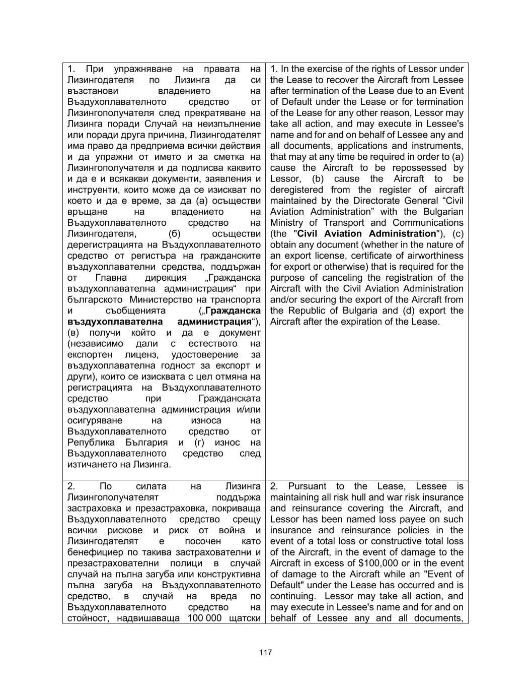 117 1. При упражняване на правата на Лизингодателя по Лизинга да си възстанови владението на Въздухоплавателното средство от Лизингополучателя след прекратяване на Лизинга поради Случай на неизпълнение или поради друга причина, Лизингодателят има право да предприема всички действия и да упражни от името и за сметка на Лизингополучателя и да подписва каквито и да е и всякакви документи, заявления и инструенти, които може да се изискват по което и да е време, за да (a) осъществи връщане на владението на Въздухоплавателното средство на Лизингодателя, (б) осъществи дерегистрацията на Въздухоплавателното средство от регистъра на гражданските въздухоплавателни средства, поддържан от Главна дирекция „Гражданска въздухоплавателна администрация“ при българското Министерство на транспорта и съобщенията („Гражданска въздухоплавателна администрация“), (в) получи който и да е документ (независимо дали с естеството на експортен лиценз, удостоверение за въздухоплавателна годност за експорт и други), които се изисквата с цел отмяна на регистрацията на Въздухоплавателното средство при Гражданската въздухоплавателна администрация и/или осигуряване на износа на Въздухоплавателното средство от Република България и (г) износ на Въздухоплавателното средство след изтичането на Лизинга. 1. In the exercise of the rights of Lessor under the Lease to recover the Aircraft from Lessee after termination of the Lease due to an Event of Default under the Lease or for termination of the Lease for any other reason, Lessor may take all action, and may execute in Lessee's name and for and on behalf of Lessee any and all documents, applications and instruments, that may at any time be required in order to (a) cause the Aircraft to be repossessed by Lessor, (b) cause the Aircraft to be deregistered from the register of aircraft maintained by the Directorate General “Civil Aviation Administration” with the Bulgarian Ministry of Transport and Communications (the "Civil Aviation Administration"), (c) obtain any document (whether in the nature of an export license, certificate of airworthiness for export or otherwise) that is required for the purpose of canceling the registration of the Aircraft with the Civil Aviation Administration and/or securing the export of the Aircraft from the Republic of Bulgaria and (d) export the Aircraft after the expiration of the Lease. 2. По силата на Лизинга Лизингополучателят поддържа застраховка и презастраховка, покриваща Въздухоплавателното средство срещу всички рискове и риск от война и Лизингодателят е посочен като бенефициер по такива застрахователни и презастрахователни полици в случай случай на пълна загуба или конструктивна пълна загуба на Въздухоплавателното средство, в случай на вреда по Въздухоплавателното средство на стойност, надвишаваща 100 000 щатски 2. Pursuant to the Lease, Lessee is maintaining all risk hull and war risk insurance and reinsurance covering the Aircraft, and Lessor has been named loss payee on such insurance and reinsurance policies in the event of a total loss or constructive total loss of the Aircraft, in the event of damage to the Aircraft in excess of $100,000 or in the event of damage to the Aircraft while an "Event of Default" under the Lease has occurred and is continuing. Lessor may take all action, and may execute in Lessee's name and for and on behalf of Lessee any and all documents,