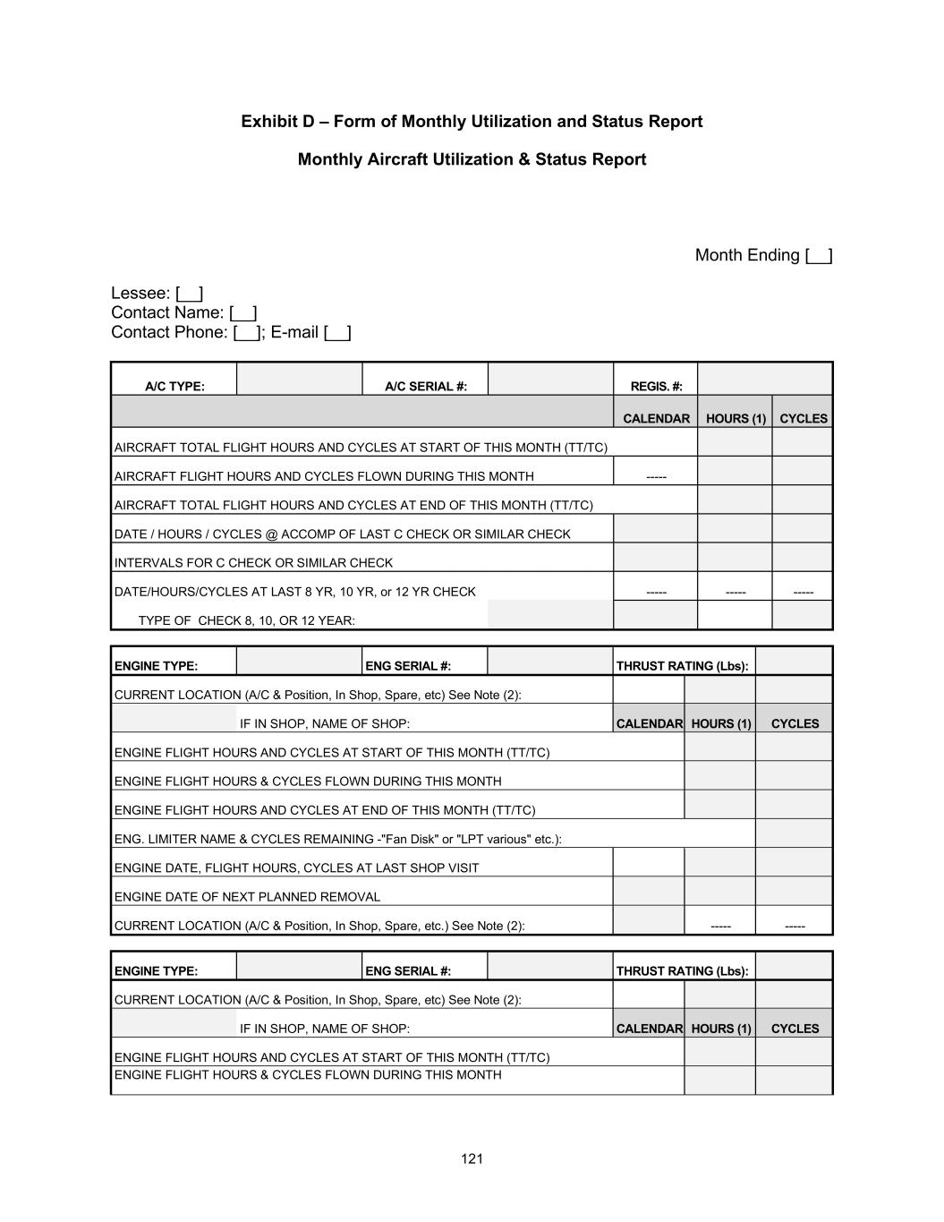 121 Exhibit D – Form of Monthly Utilization and Status Report Monthly Aircraft Utilization & Status Report Month Ending [__] Lessee: [__] Contact Name: [__] Contact Phone: [__]; E-mail [__] A/C TYPE: A/C SERIAL #: REGIS. #: CALENDAR HOURS (1) CYCLES AIRCRAFT TOTAL FLIGHT HOURS AND CYCLES AT START OF THIS MONTH (TT/TC) AIRCRAFT FLIGHT HOURS AND CYCLES FLOWN DURING THIS MONTH ----- AIRCRAFT TOTAL FLIGHT HOURS AND CYCLES AT END OF THIS MONTH (TT/TC) DATE / HOURS / CYCLES @ ACCOMP OF LAST C CHECK OR SIMILAR CHECK INTERVALS FOR C CHECK OR SIMILAR CHECK DATE/HOURS/CYCLES AT LAST 8 YR, 10 YR, or 12 YR CHECK ----- ----- ----- TYPE OF CHECK 8, 10, OR 12 YEAR: ENGINE TYPE: ENG SERIAL #: THRUST RATING (Lbs): CURRENT LOCATION (A/C & Position, In Shop, Spare, etc) See Note (2): IF IN SHOP, NAME OF SHOP: CALENDAR HOURS (1) CYCLES ENGINE FLIGHT HOURS AND CYCLES AT START OF THIS MONTH (TT/TC) ENGINE FLIGHT HOURS & CYCLES FLOWN DURING THIS MONTH ENGINE FLIGHT HOURS AND CYCLES AT END OF THIS MONTH (TT/TC) ENG. LIMITER NAME & CYCLES REMAINING -"Fan Disk" or "LPT various" etc.): ENGINE DATE, FLIGHT HOURS, CYCLES AT LAST SHOP VISIT ENGINE DATE OF NEXT PLANNED REMOVAL CURRENT LOCATION (A/C & Position, In Shop, Spare, etc.) See Note (2): ----- ----- ENGINE TYPE: ENG SERIAL #: THRUST RATING (Lbs): CURRENT LOCATION (A/C & Position, In Shop, Spare, etc) See Note (2): IF IN SHOP, NAME OF SHOP: CALENDAR HOURS (1) CYCLES ENGINE FLIGHT HOURS AND CYCLES AT START OF THIS MONTH (TT/TC) ENGINE FLIGHT HOURS & CYCLES FLOWN DURING THIS MONTH