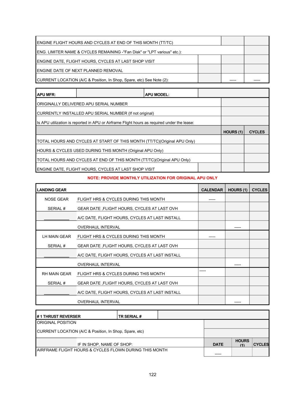 122 ENGINE FLIGHT HOURS AND CYCLES AT END OF THIS MONTH (TT/TC) ENG. LIMITER NAME & CYCLES REMAINING -"Fan Disk" or "LPT various" etc.): ENGINE DATE, FLIGHT HOURS, CYCLES AT LAST SHOP VISIT ENGINE DATE OF NEXT PLANNED REMOVAL CURRENT LOCATION (A/C & Position, In Shop, Spare, etc) See Note (2): ----- ----- APU MFR: APU MODEL: ORIGINALLY DELIVERED APU SERIAL NUMBER CURRENTLY INSTALLED APU SERIAL NUMBER (If not original) Is APU utilization is reported in APU or Airframe Flight hours as required under the lease: HOURS (1) CYCLES TOTAL HOURS AND CYCLES AT START OF THIS MONTH (TT/TC)(Original APU Only) HOURS & CYCLES USED DURING THIS MONTH (Original APU Only) TOTAL HOURS AND CYCLES AT END OF THIS MONTH (TT/TC)(Original APU Only) ENGINE DATE, FLIGHT HOURS, CYCLES AT LAST SHOP VISIT NOTE: PROVIDE MONTHLY UTILIZATION FOR ORIGINAL APU ONLY LANDING GEAR CALENDAR HOURS (1) CYCLES NOSE GEAR FLIGHT HRS & CYCLES DURING THIS MONTH ----- SERIAL # GEAR DATE ,FLIGHT HOURS, CYCLES AT LAST OVH ____________ A/C DATE, FLIGHT HOURS, CYCLES AT LAST INSTALL OVERHAUL INTERVAL ----- LH MAIN GEAR FLIGHT HRS & CYCLES DURING THIS MONTH ----- SERIAL # GEAR DATE ,FLIGHT HOURS, CYCLES AT LAST OVH ____________ A/C DATE, FLIGHT HOURS, CYCLES AT LAST INSTALL OVERHAUL INTERVAL ----- RH MAIN GEAR FLIGHT HRS & CYCLES DURING THIS MONTH ----- SERIAL # GEAR DATE ,FLIGHT HOURS, CYCLES AT LAST OVH ____________ A/C DATE, FLIGHT HOURS, CYCLES AT LAST INSTALL OVERHAUL INTERVAL ----- # 1 THRUST REVERSER TR SERIAL # ORIGINAL POSITION CURRENT LOCATION (A/C & Position, In Shop, Spare, etc) IF IN SHOP, NAME OF SHOP: DATE HOURS (1) CYCLES AIRFRAME FLIGHT HOURS & CYCLES FLOWN DURING THIS MONTH -----